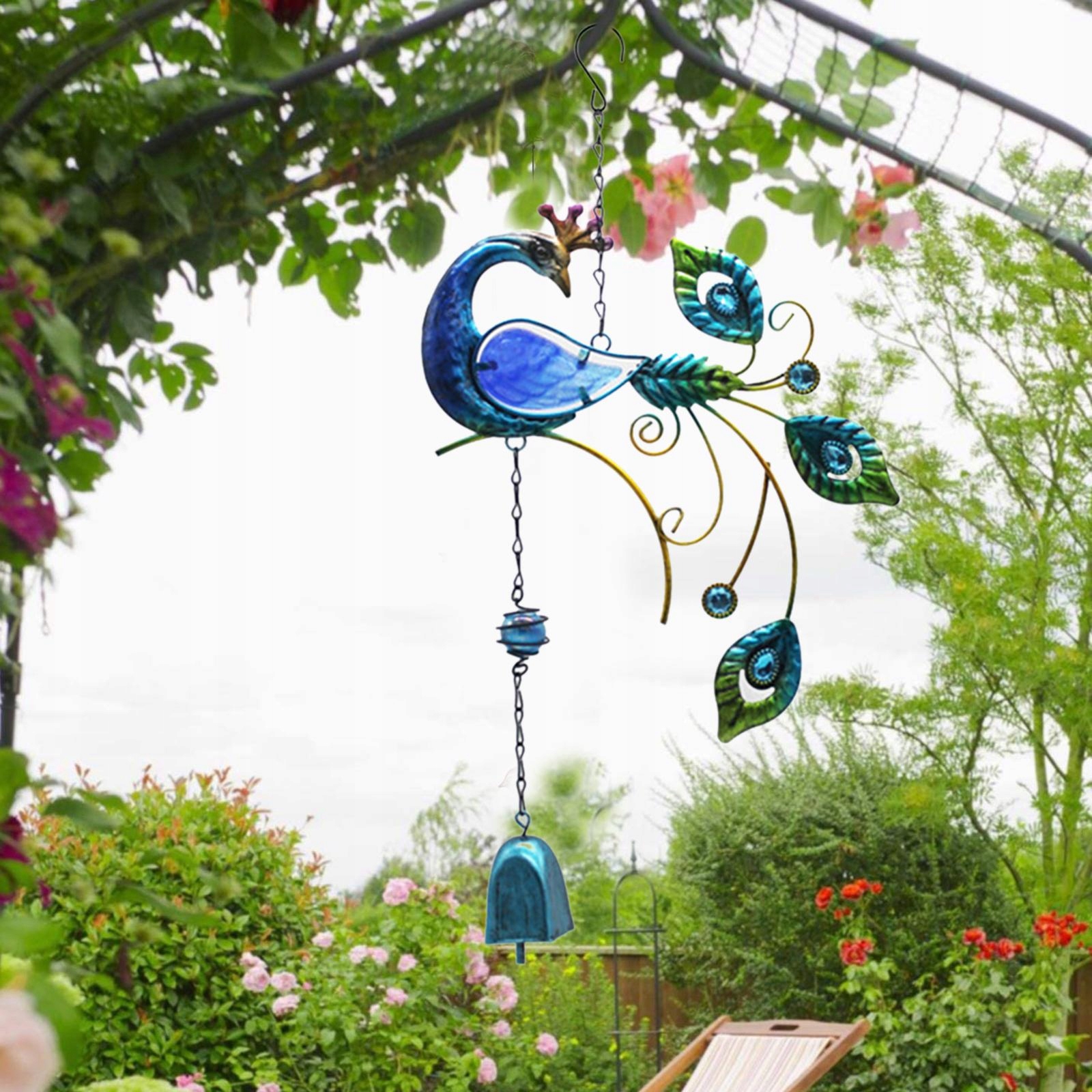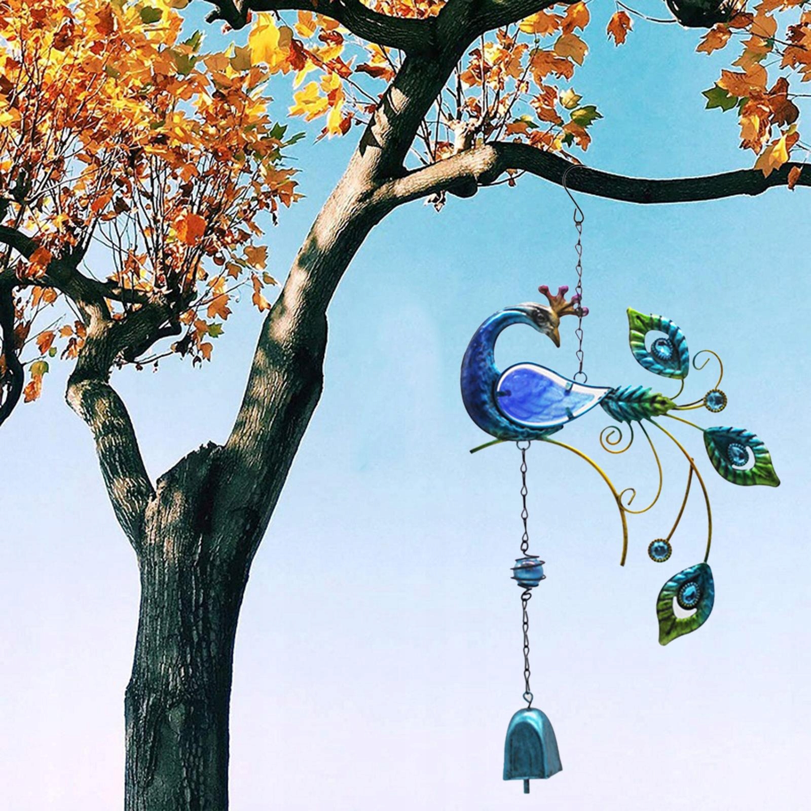 Металевий вітряний колокольчик у формі павича, висить синій орнамент