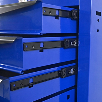- Відкривання та закривання ящиків шафи для інструментів відбувається дуже плавно завдяки використанню ящиків на кулькових підшипниках.