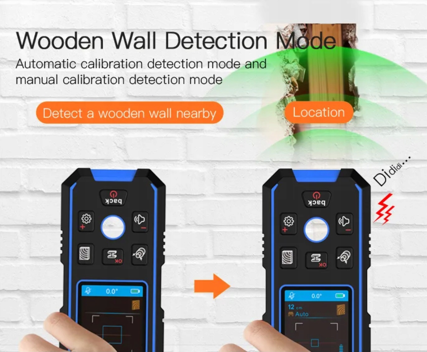 - Функція виявлення: Виявлення металів/Виявлення деревини/Виявлення потужності проти струму. деревина: 3,8 см / кабель напруги (AC): 5 см / не магнітне метал: 10 см / магнітний метал: 12 см. Оснащений функцією автоматичного вимкнення. Звук та візуальний