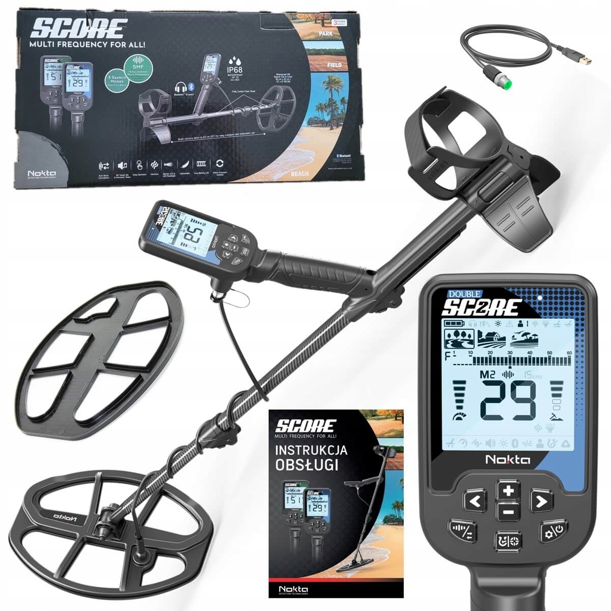 Nokta Double SCORE 2:це чудовий вибір для людей, які хочуть увійти у світ пошуку за допомогою простого детектора з новітніми технологіями, він дозволяє вам входити у воду і навіть занурюйтеся на глибину до 5 метрів. У нас є програма Plaża (пляж), яка одночасно використовує кілька частот для мінімізації перешкод, спричинених високою мінералізацією солоної води b>програми, наприклад Pole і Park підтримують як одну частоту 15 кГц, так і одночасну багаточастотність на вибір, яка донедавна була доступна лише в дорогих детекторах: