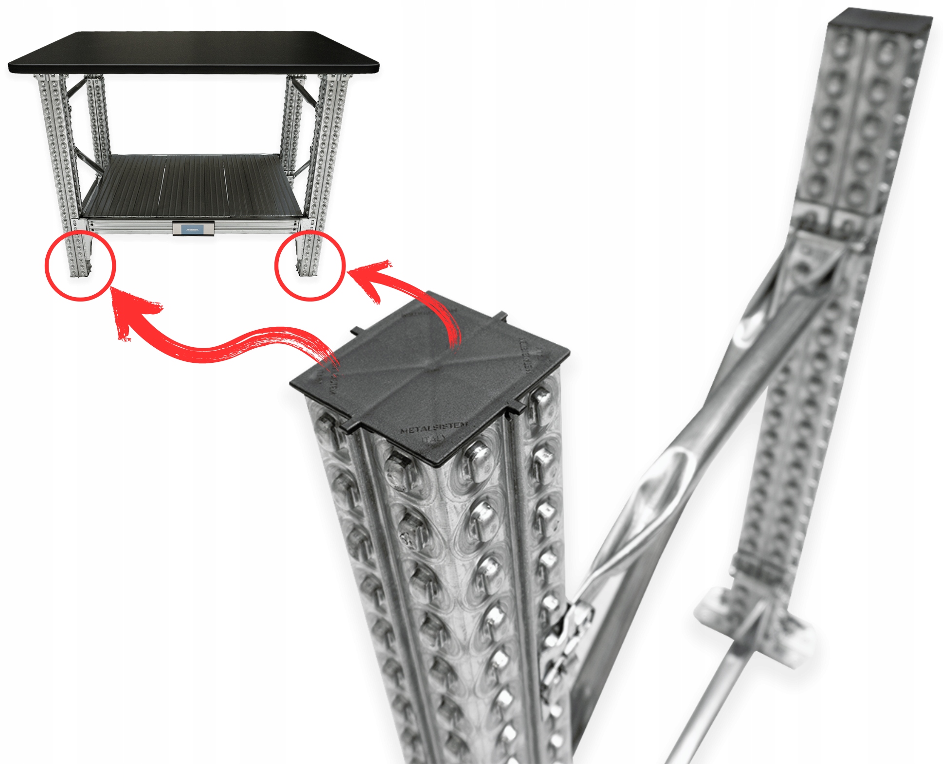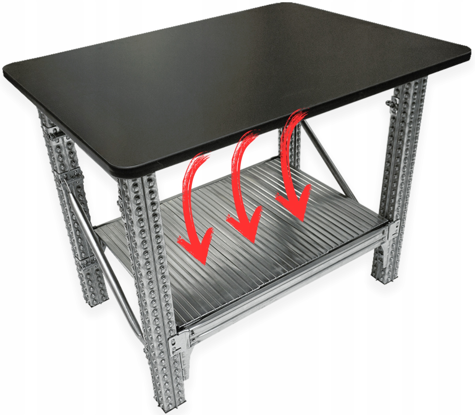 Конструкція столу виготовлена із 100% закритого профілю холодноформованої оцинкованої сталі з найякіснішими компонентами палетної системи Super 4-5-6, яка використовується в складських стелажах для важких зберігання.