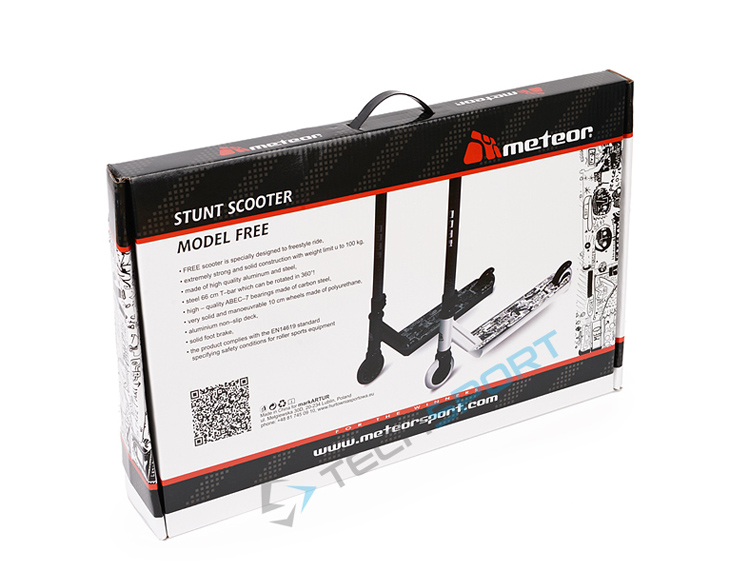 Meteor stunt Tracker — це трюковий самокат, розроблений для досвідчених користувачів, виготовлений із алюмінію найвищої якості. Це професійний скутер з дуже міцною та довговічною конструкцією, яка дозволяє агресивно та екстремально їздити, стрибати та всілякі трюки на рампах. Особливе з'єднання керма з підсідельним штирем і відсутність складних частин забезпечують максимальну довговічність. Високоякісні підшипники ABEC-7 і відповідна твердість, великі поліуретанові колеса на алюмінієвому ободі забезпечують швидку і тиху їзду. Над заднім колесом є ножне гальмо.Всі з'єднувальні та кріпильні гвинти виготовлені зі сталі, що гарантує довговічність з'єднань. Кермо оснащено гумовими ручками для надійного захоплення. Упаковано в коробку, ідеально підходить для подарунка.