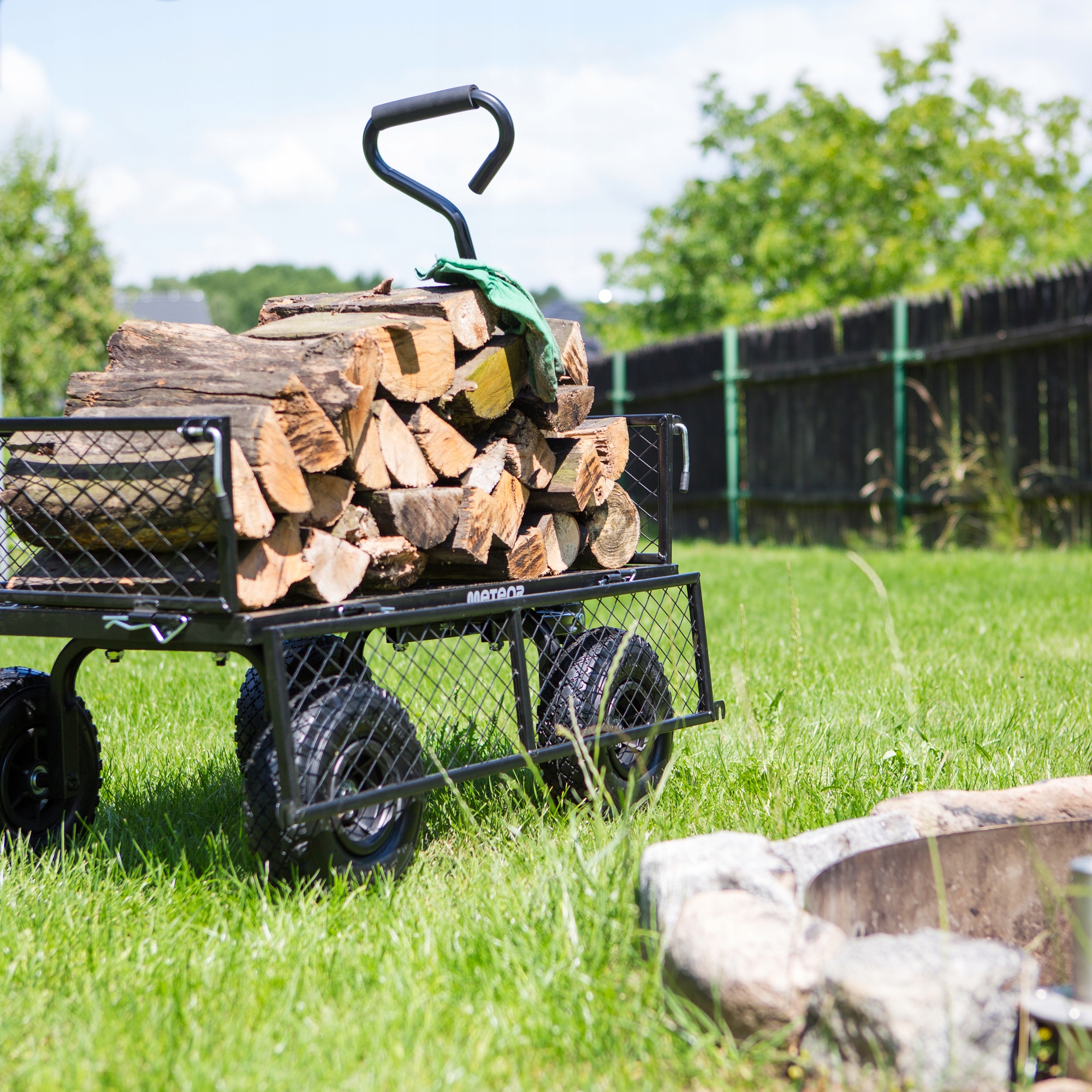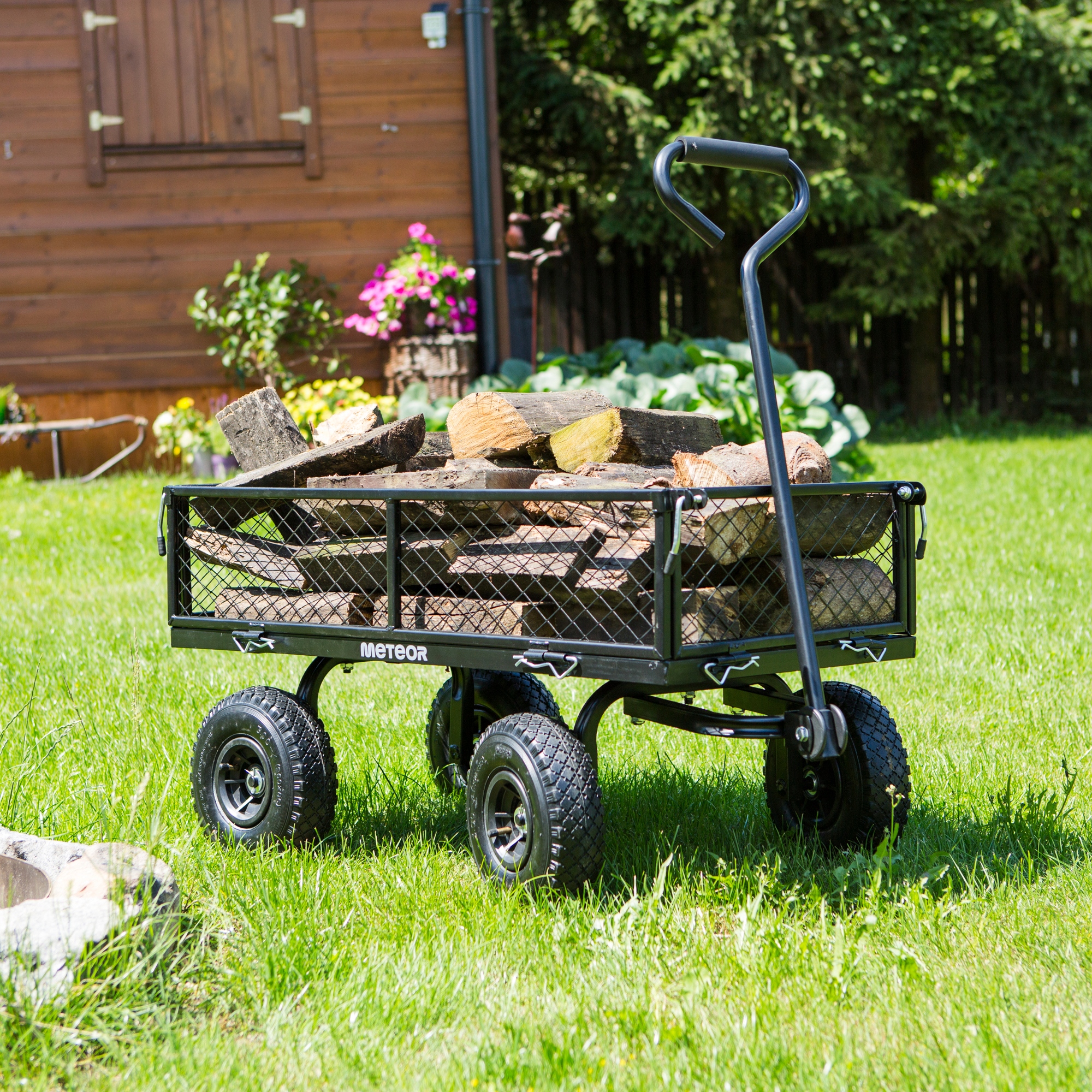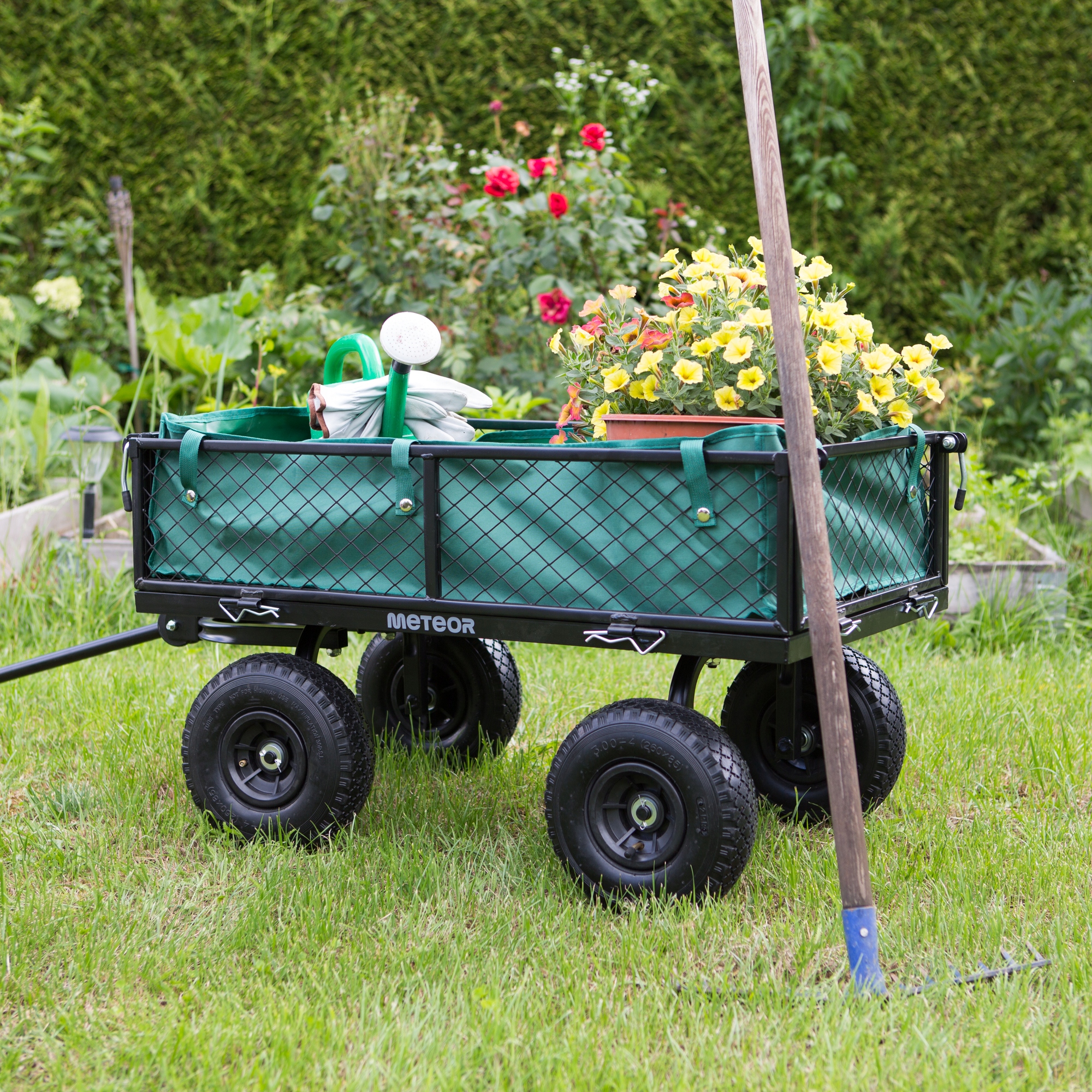 - Тверда конструкція - Метеор сталевих візків транспортує навантаження до 100 кг, полегшуючи спину та полегшуючи транспортування деревини, листя, трави, ґрунту та горщиків. 4 4 Амортизація в нерівній місцевості. 4