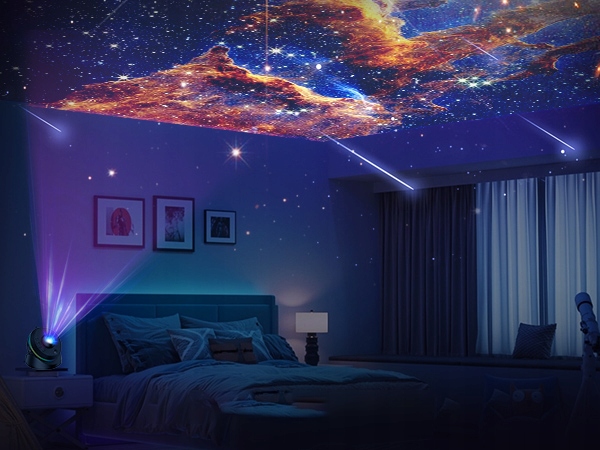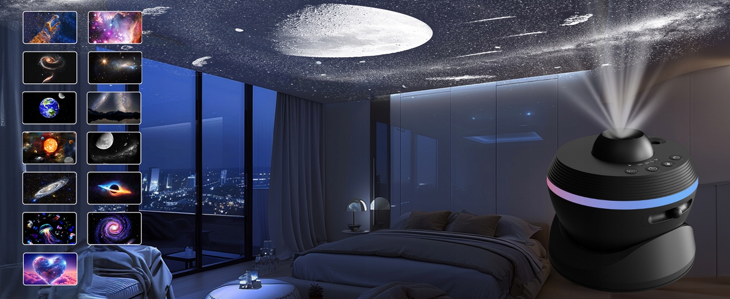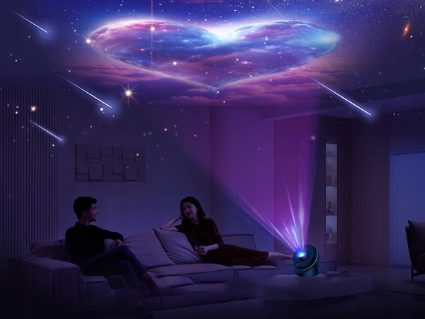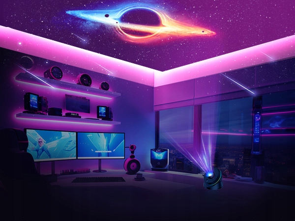 Проектор Galaxy Light використовує вдосконалений модуль короткого кидання, повертаючи верхню головку, щоб мати можливість використовувати функцію управління на відстані проекції. Повернена на 360 ° та підтримувана відстань проекції до 16,4 футів і 754 м2 футів може використовуватися в різних умовах використання. Світло -швидкий режим світла -швидкості імітує повільну орбіту планети. Ви можете перейти на звичайні трибунали відповідно до ваших функцій.