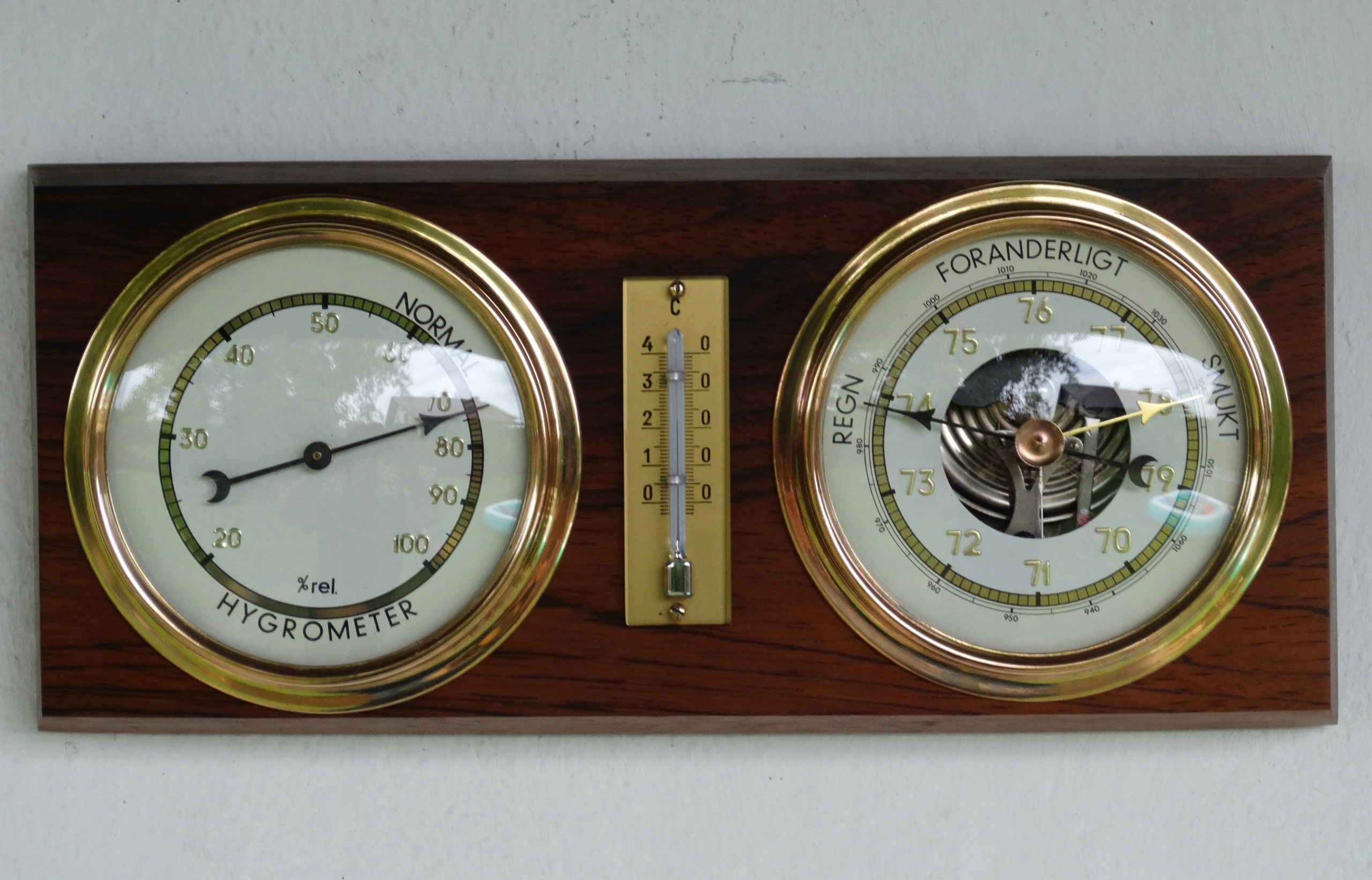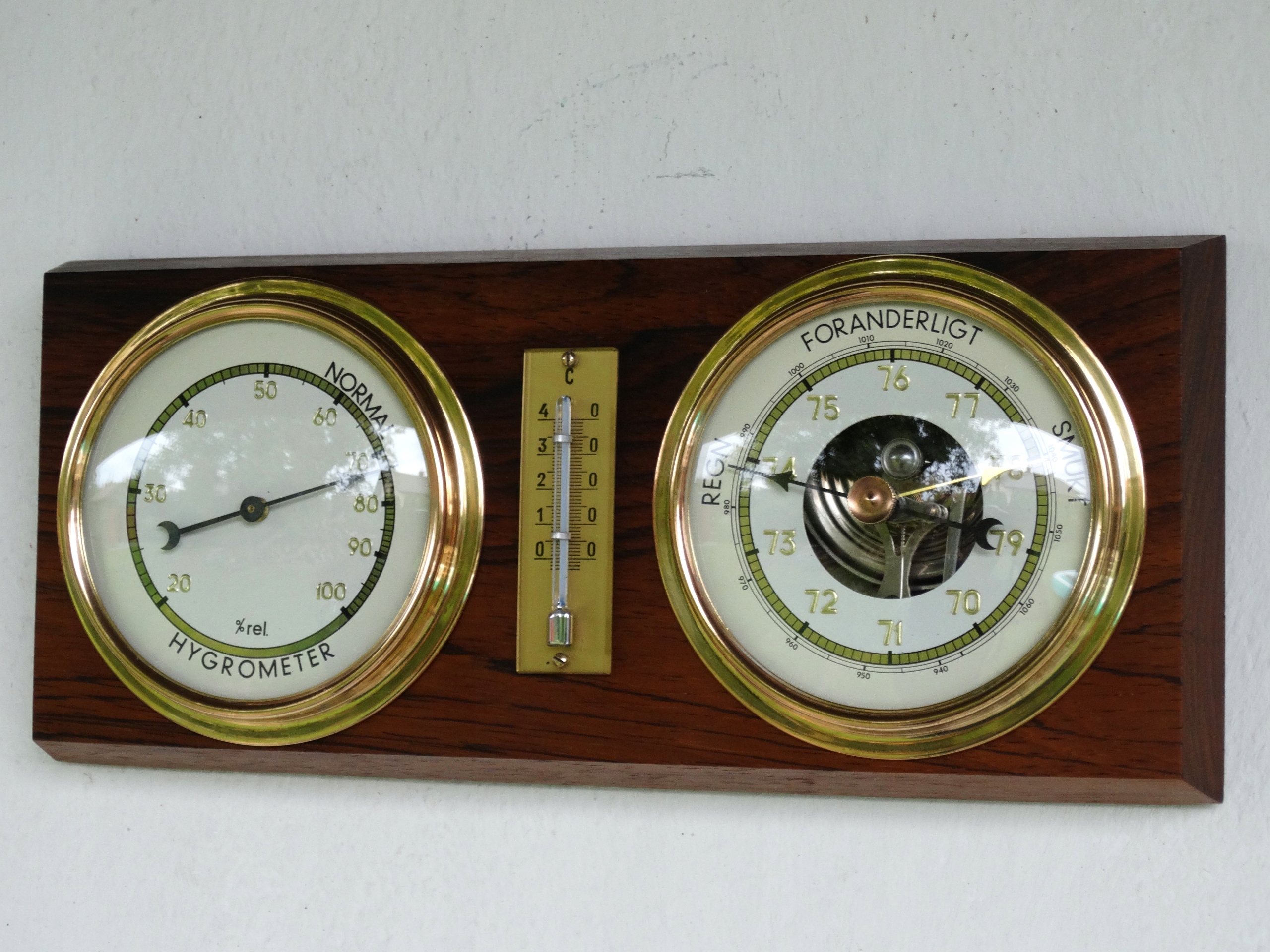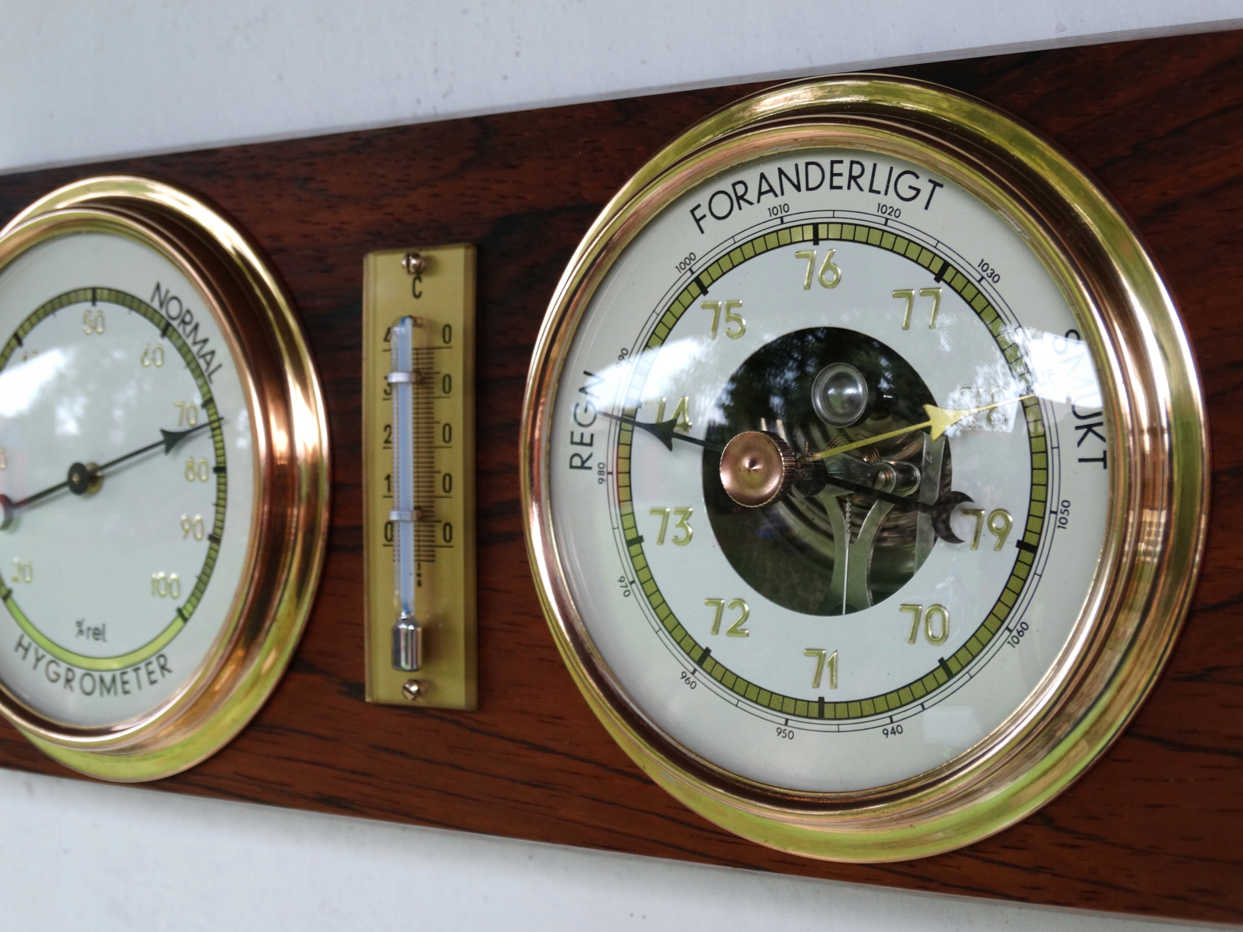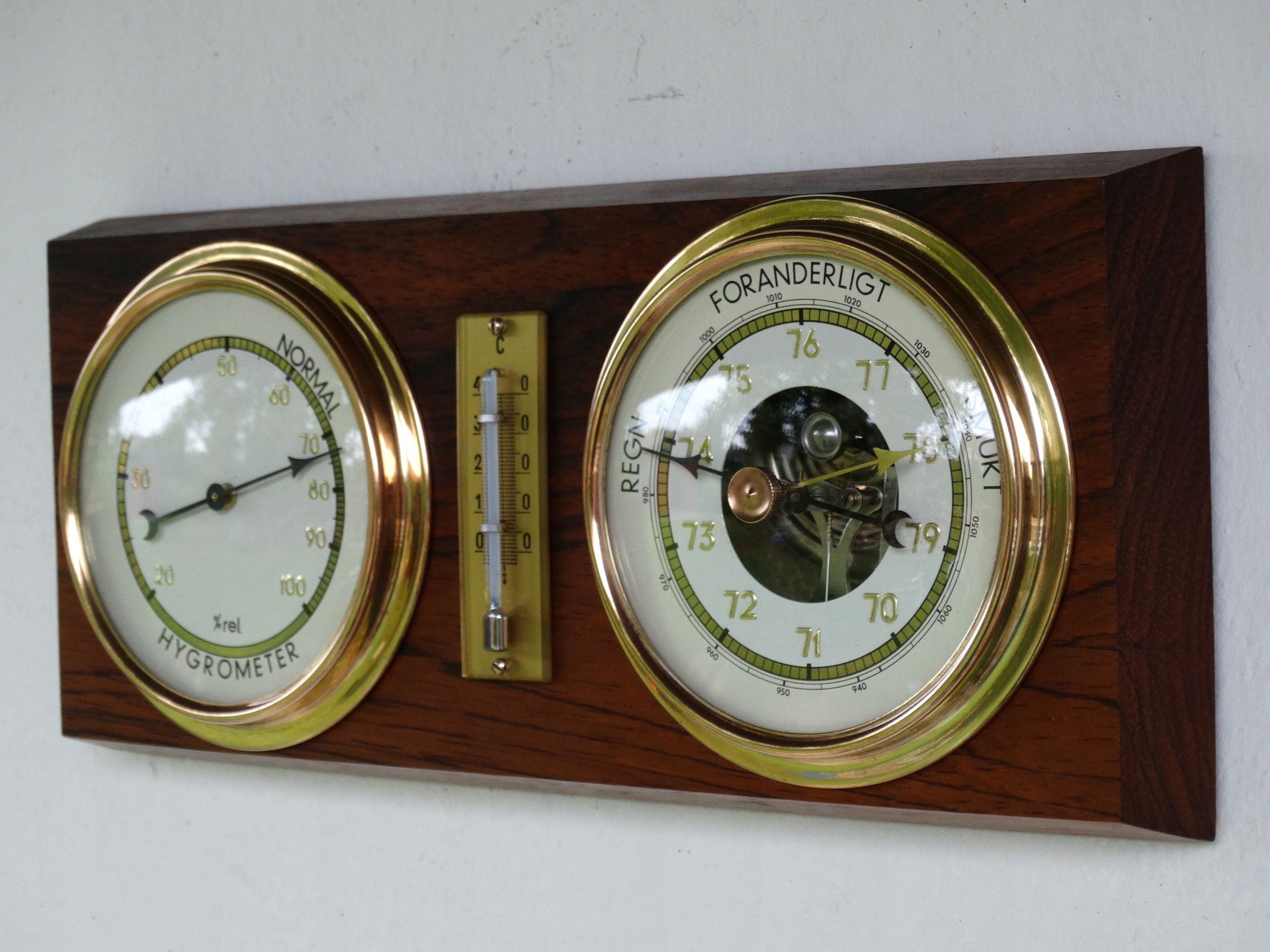 Метеостанція 3 в 1, барометр, гігрометр, термометр. Дерев'яний каркас з латунними елементами. Підходить як для сучасних, так і для класичних інтер'єрів. Має сліди нормального використання, видно на фото, ніде не пошкоджено.