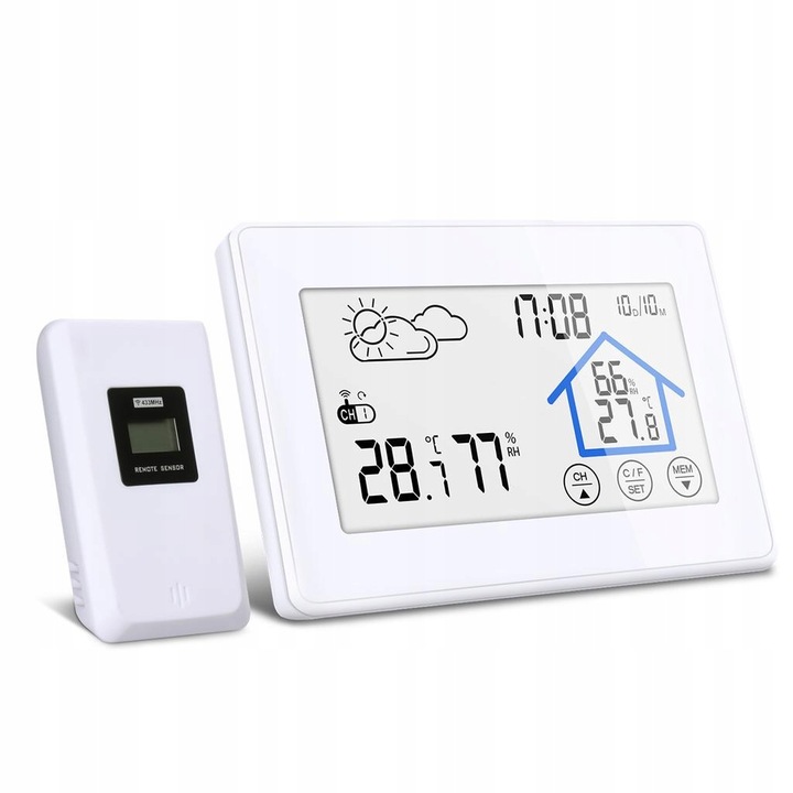Продукт поставляється з базовим блоком і одним зовнішнім блоком, які постійно підтримують поточні показники вологості та температури.