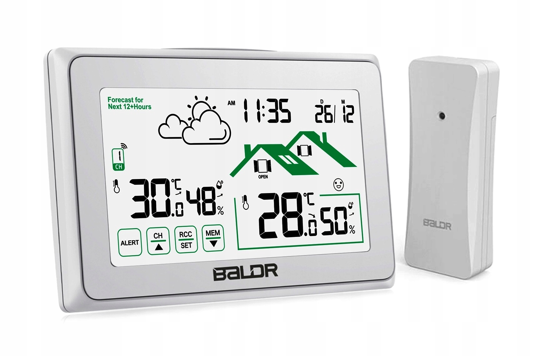 Внутрішній Baldr B340-V8 метеостанція має великий чіткий РК-дисплей із великими цифрами. На дисплеї відображаються поточні вимірювання внутрішньої та зовнішньої температури та вологості, а також стрілки тенденцій, які вказують, чи температура чи вологість підвищується, падає чи залишається незмінною. Записує максимальну/мінімальну температуру та вологість всередині та зовні, яка оновлюється кожні 24 години о 0:00. Індикація температури внутрішнього блоку становить від -10°C до 50°C з відхиленням ±1°C, а зовнішнього блоку -40°C до 60°C. Вологість відображається від 1 до 99% RH (±5%). Показання автоматично оновлюються кожні 30 секунд завдяки вбудованим чутливим датчикам. Температура повітря може відображатися в °C або °F.