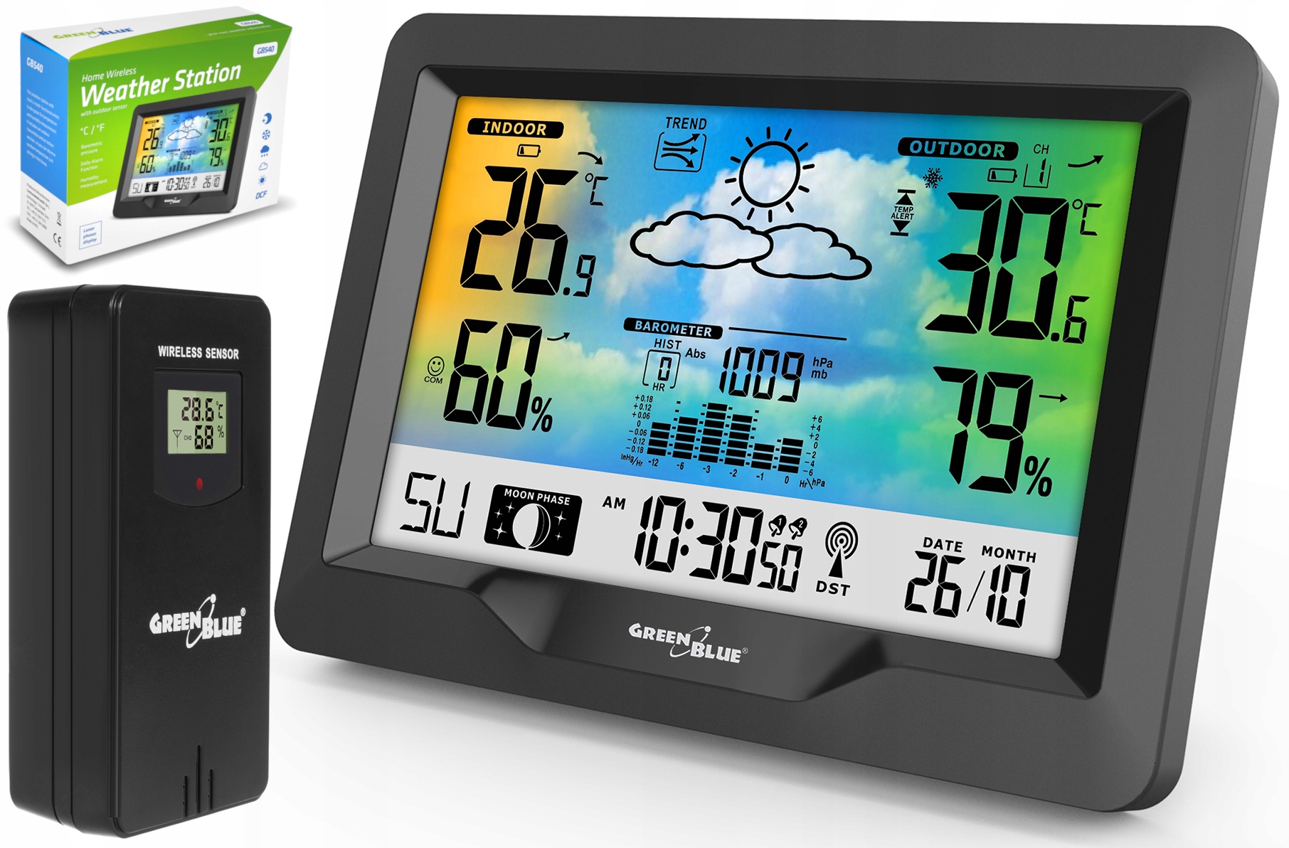 - Бездротова кольорова метеостанція GreenBlue GB540 із системою DCF