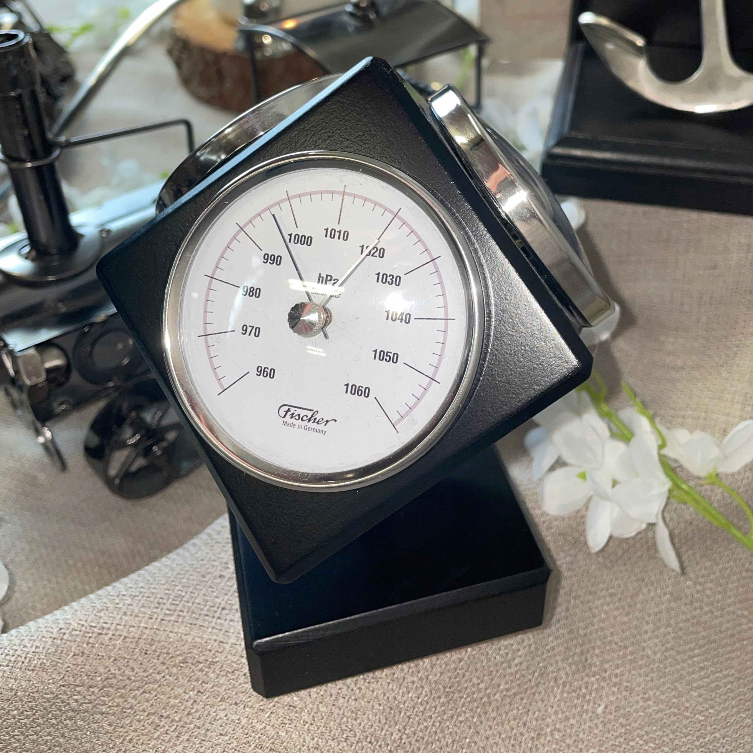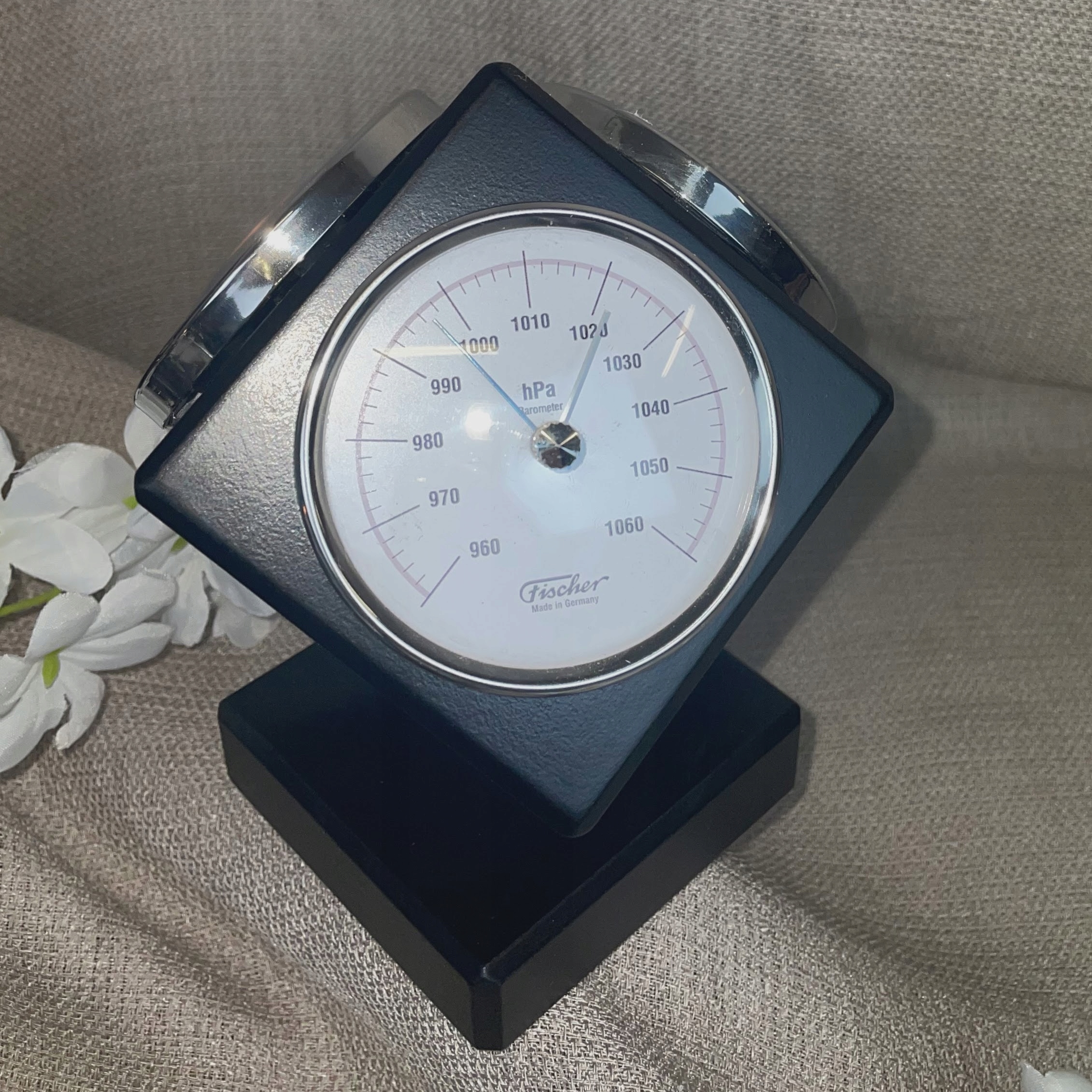 Сучасна настільна метеостанція - чорний куб - барометр, гігрометр, термометр. Виробництво Fischer - Німеччина. Гарно виготовлений, якісний продукт. Пристрій має хромовану раму, дерев'яний куб - чорного кольору.