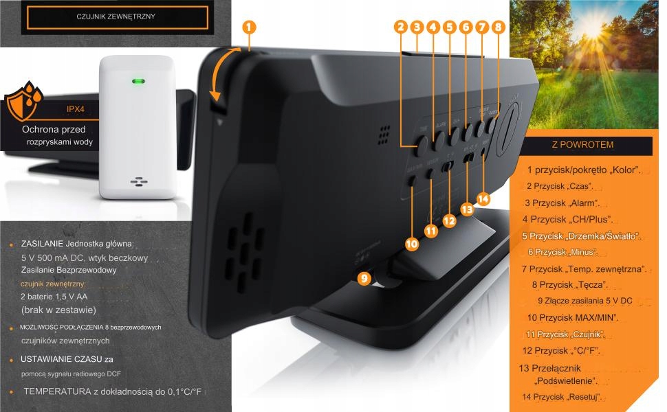 ✅Точне зовнішнє вимірювання:Зовнішній датчик постійно контролює температуру повітря і вологість. Ці дані надсилаються до центрального блоку, уможливлюючи постійний аналіз погодних умов навколо будинку.