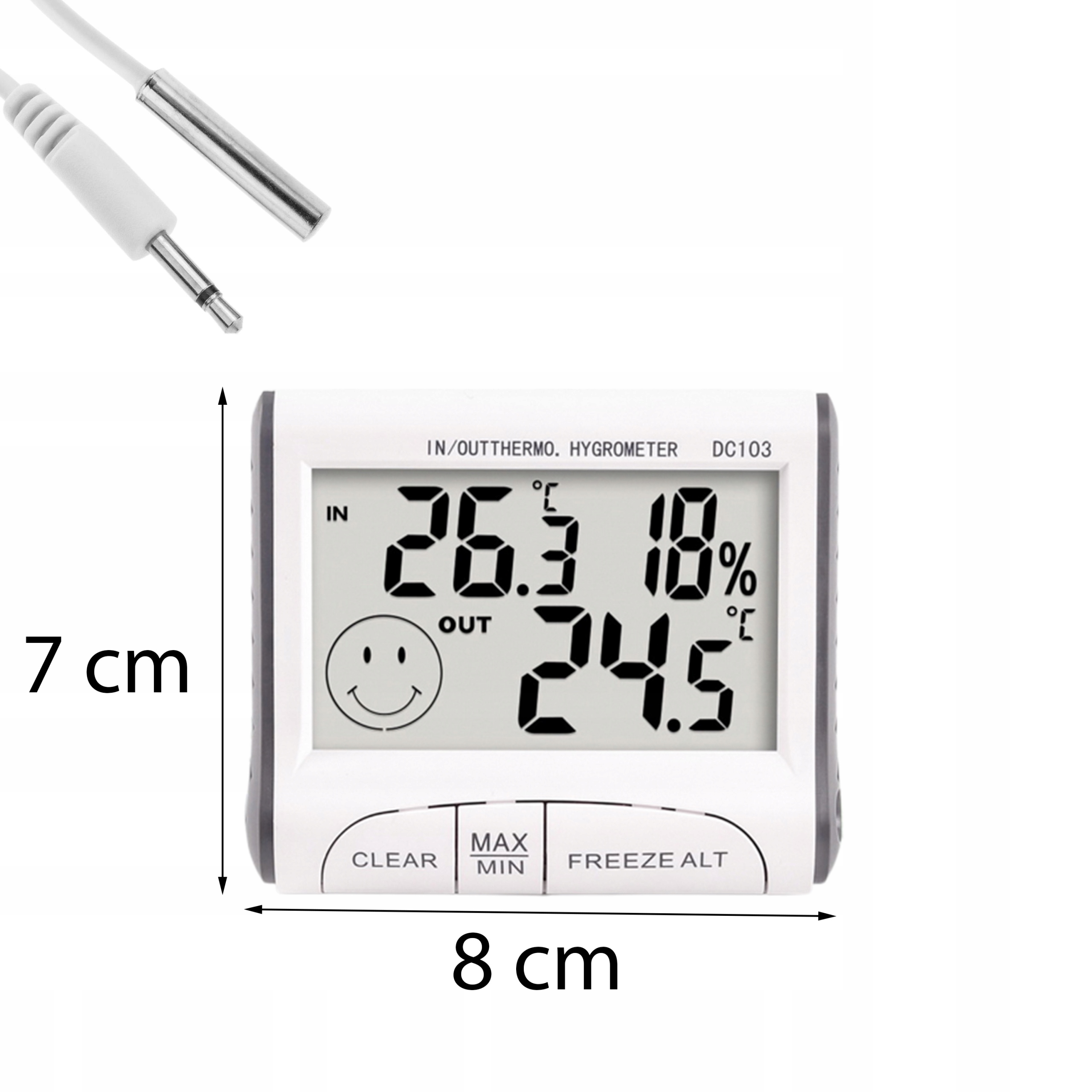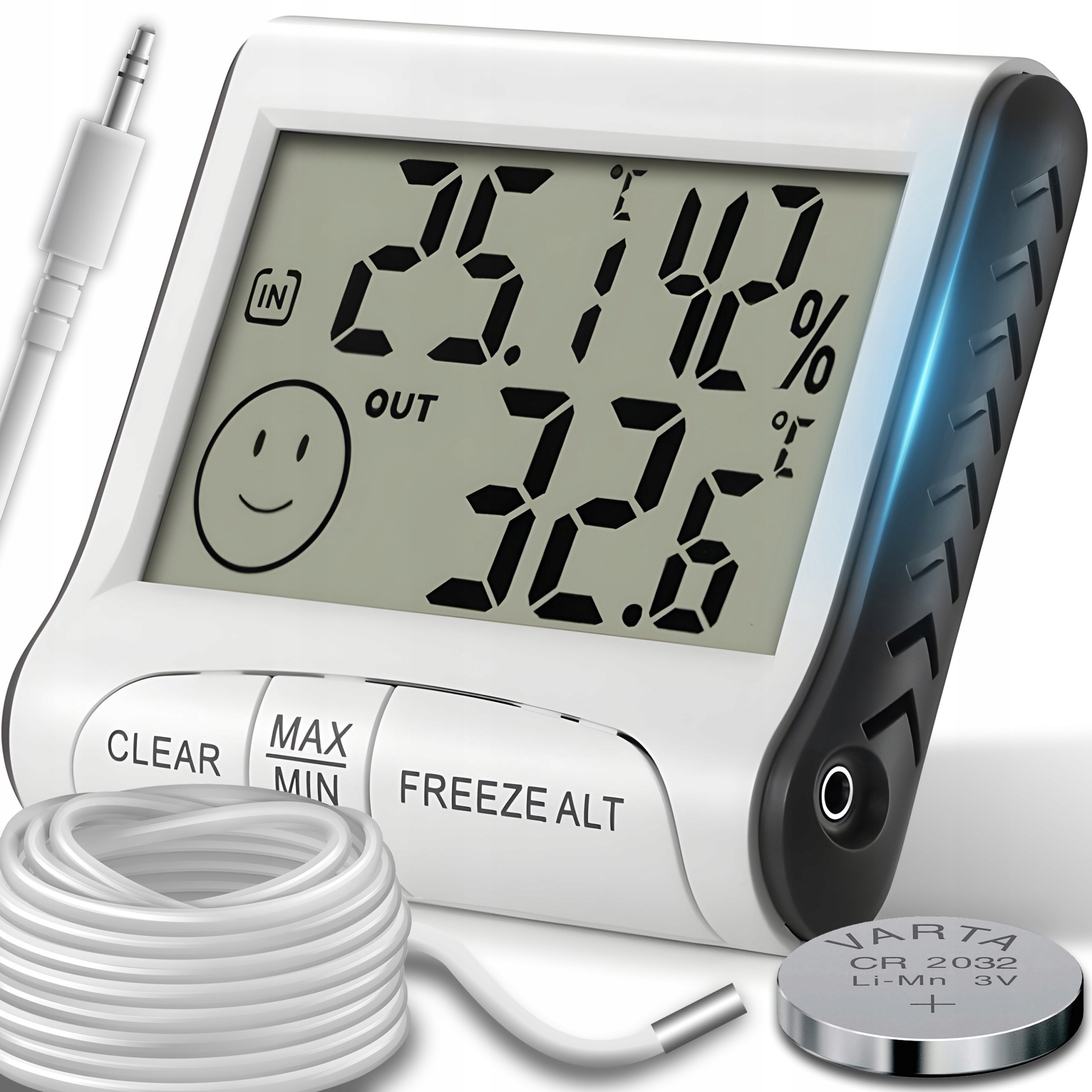 Зручний прилад для щоденного контролю температури в приміщенні. Він також має додаткові функції вимірювання вологості. Виріб оснащений легко читаним LCD дисплеєм. Виготовлений з білого пластику, він вписується в інтер'єри з меблями різних кольорів.