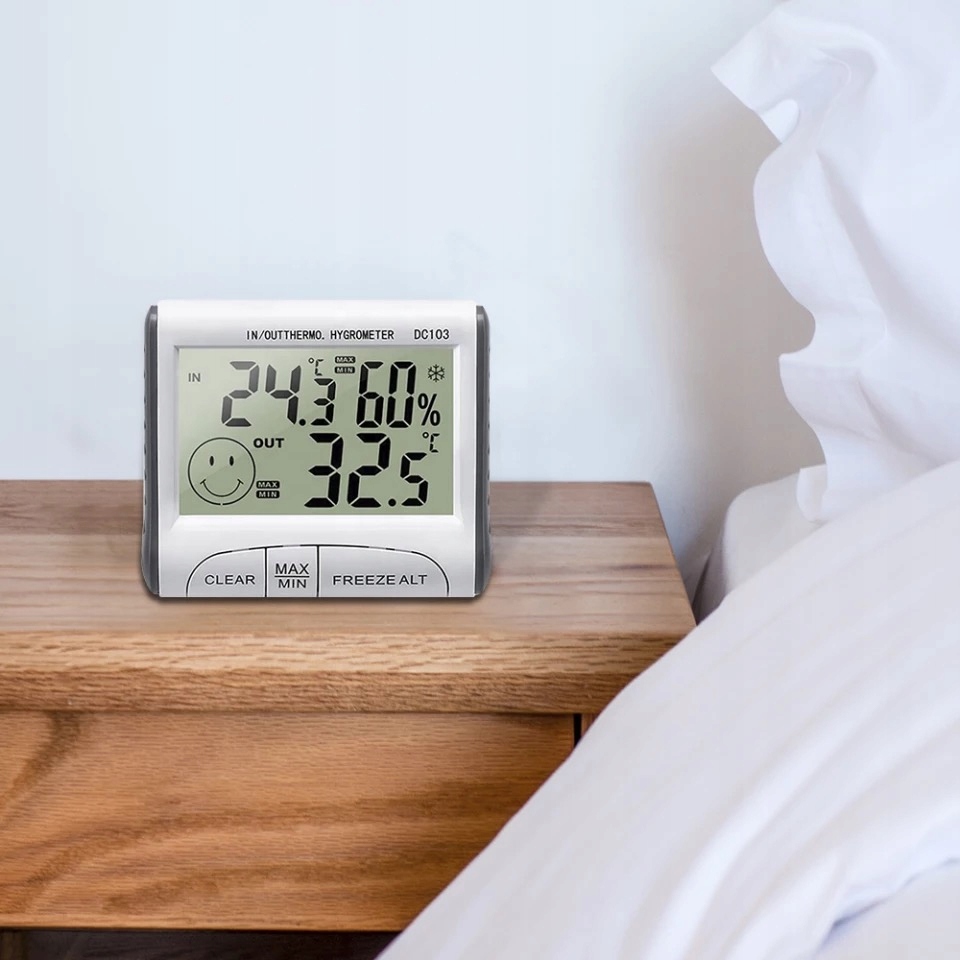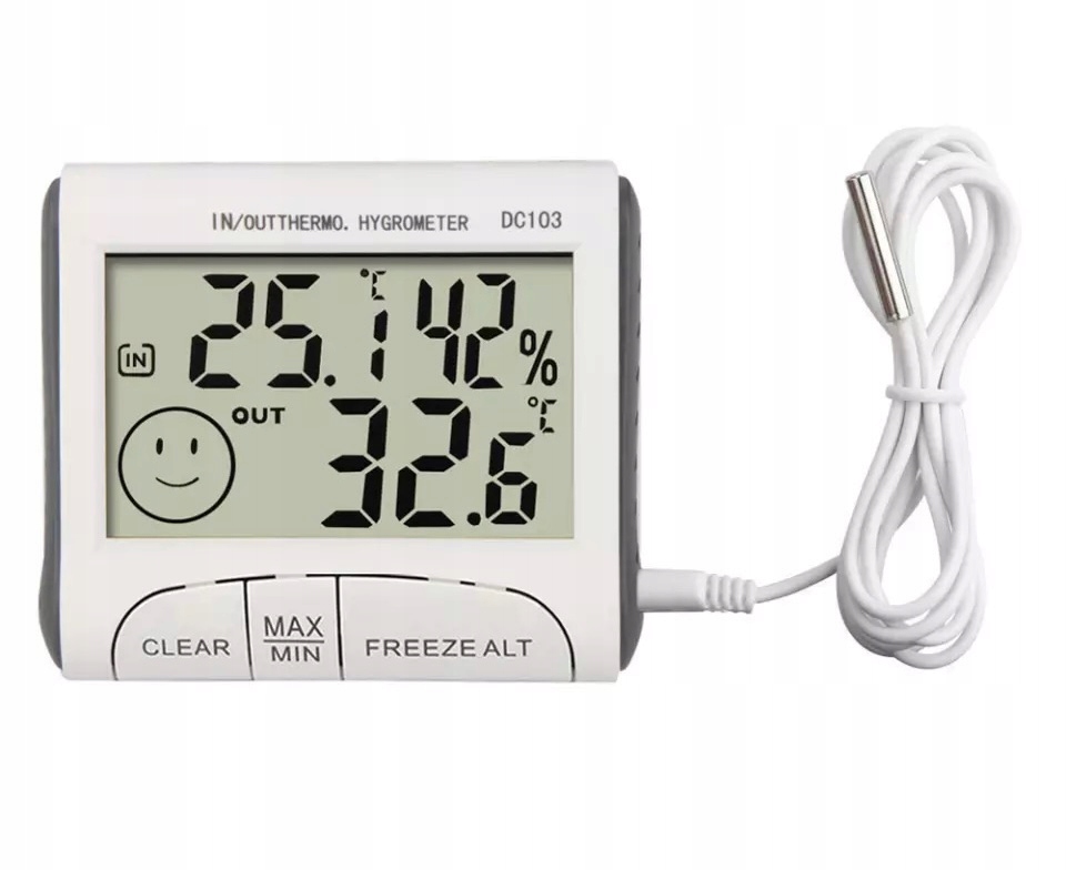 Гігрометр — це точний прилад, який використовується длявимірювання вологості повітряв приміщенні, а такожтемпературив приміщенні та на вулиці. У комплект входить спеціальний щуп для зовнішніх вимірювань. Підключіть його до пристрою, а інший кінець висуніть у вікно. Пристрій має стійку ніжку на корпусі.