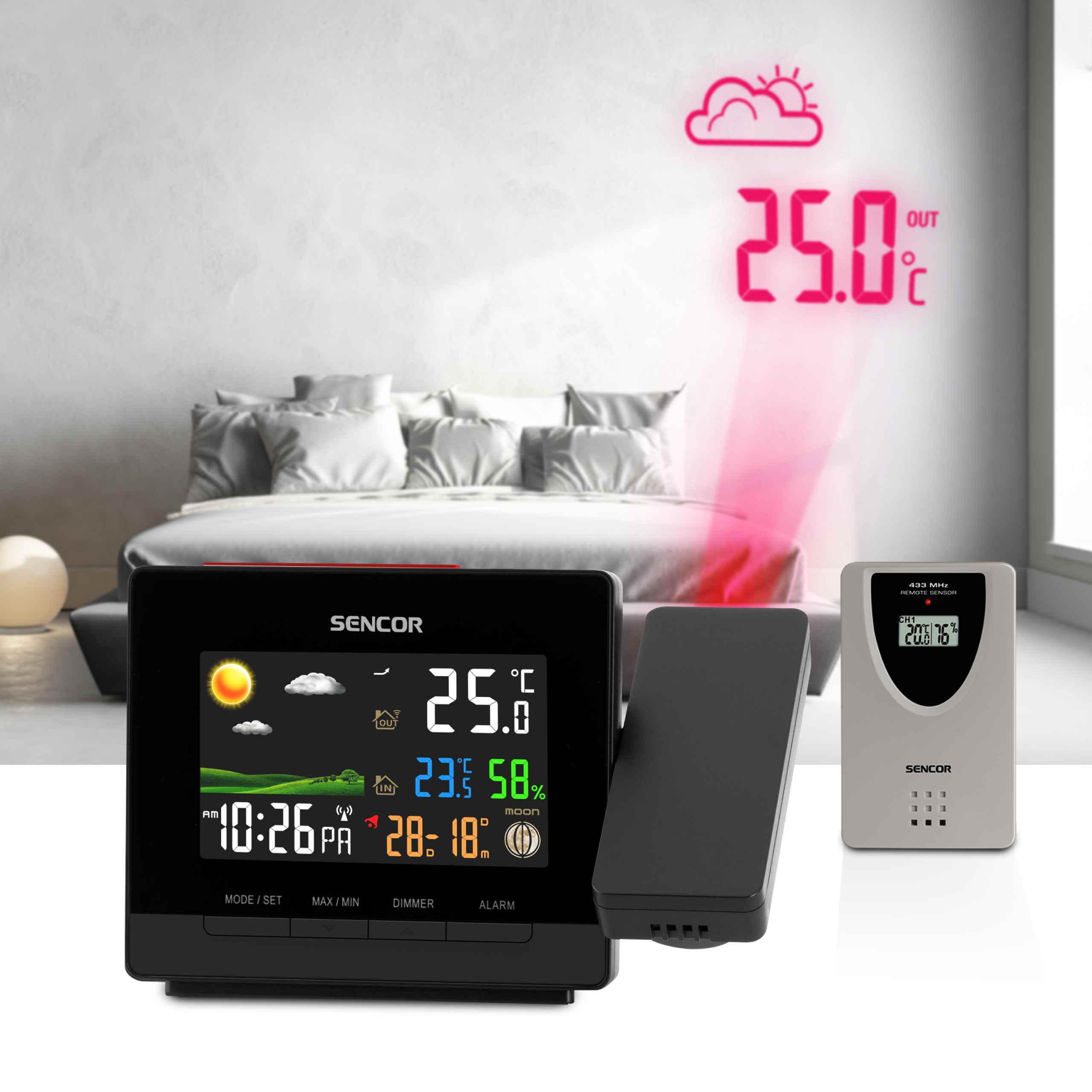 Представлена метеостанція SWS 5400 від Sencor показує значення температури як всередині, так і зовні. Також показує прогноз погоди у вигляді великих значків (сніг, дощ, хмарно, малохмарно, сонячно). Його безперечною перевагою є функція ротації проектованого контенту. Також метеостанцію можна використовувати як годинник і календар. Будильник із функцією затримки розбудить вас навіть після глибокого сну.