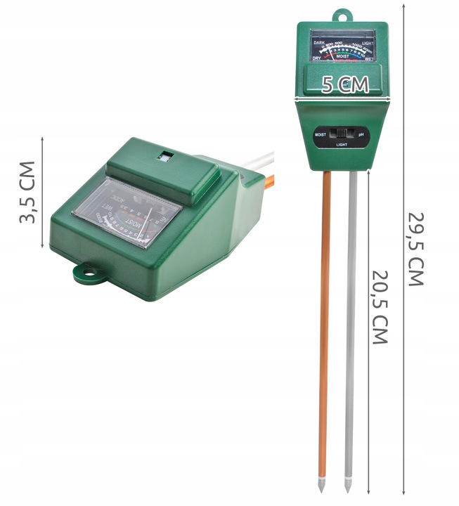 - Задовільні культури - лічильник дозволяє ретельно перевірити стан ґрунту, чітко визначати його стан. Це корисно, коли ми дбаємо про плідне вирощування рослин та овочів. Знання про підкладку сприяє плануванню, а потім підтримувати правильні умови для даного вирощування. Ми можемо діяти свідомо і отримувати задовільні культури. 4 Просто покладіть лічильник у ґрунт, встановіть перемикач на читання, яке ми хочемо отримати, і результат вийде за шкалою продукту. 4 Компактна конструкція дозволить переміщувати пристрій - його можна використовувати як всередині, так і зовні. Крім того, кислотний лічильник має ручку, яка дозволяє прикріпити її, наприклад У гаражі - тоді він завжди буде на своєму місці.