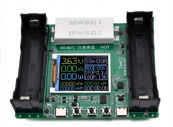 Тестер елементів 18650 дозволяє вимірювати ємність і внутрішній опір елементів і має можливість заряджати елементи через вбудований порт USB-C. Тестер має два кошики для елементів, кошик праворуч призначений для тестування елементів, а інший ліворуч для живлення системи.