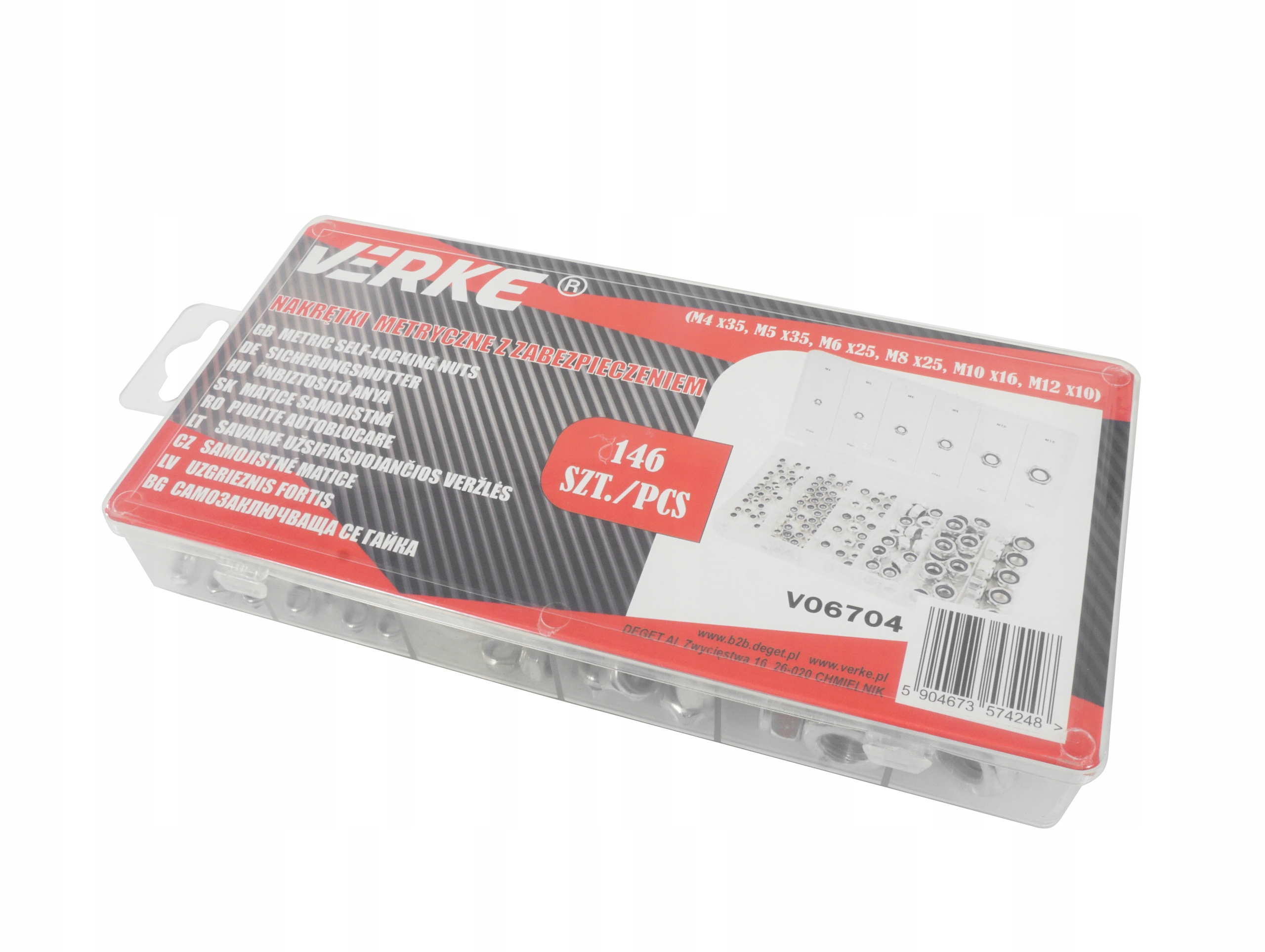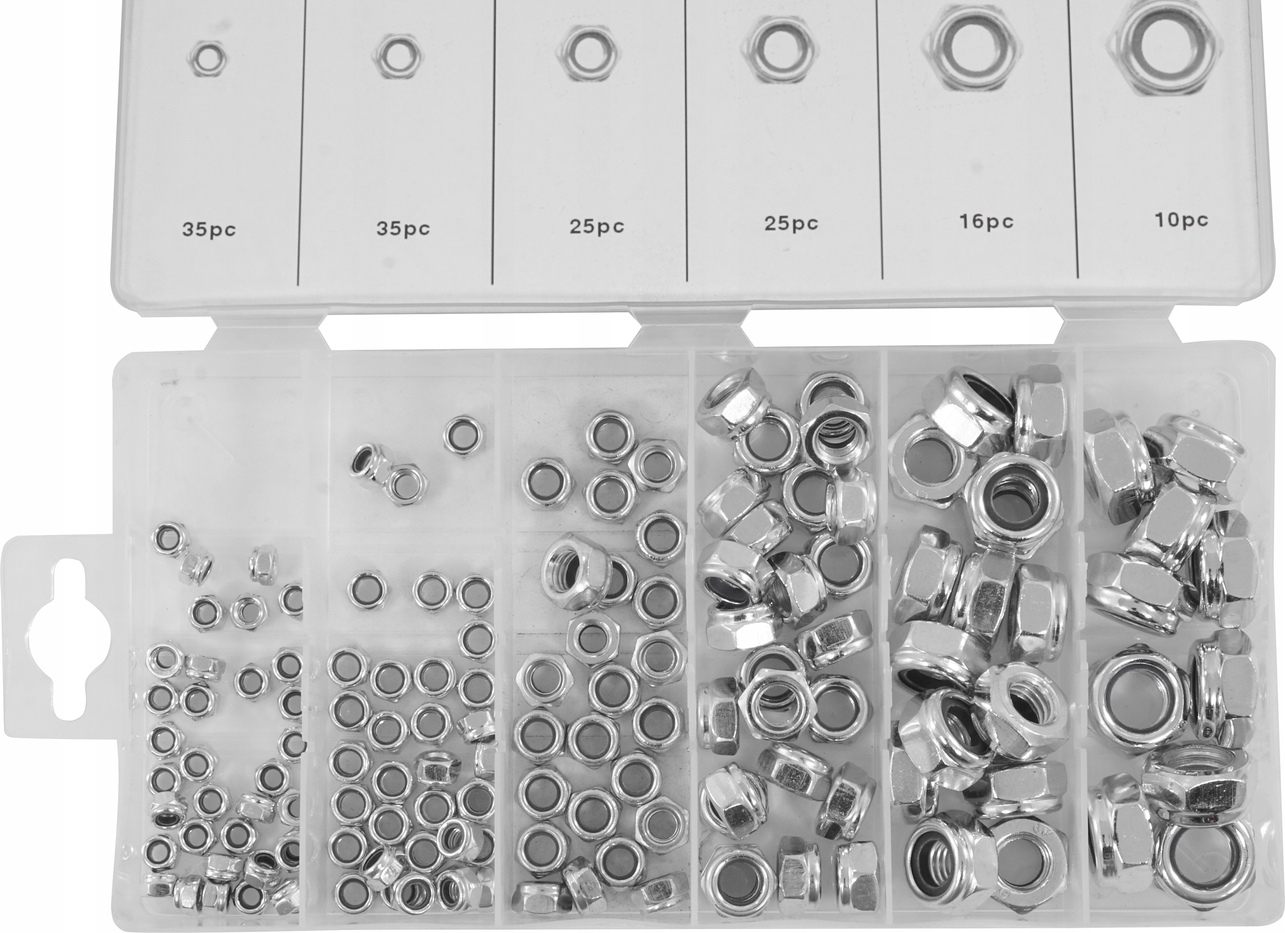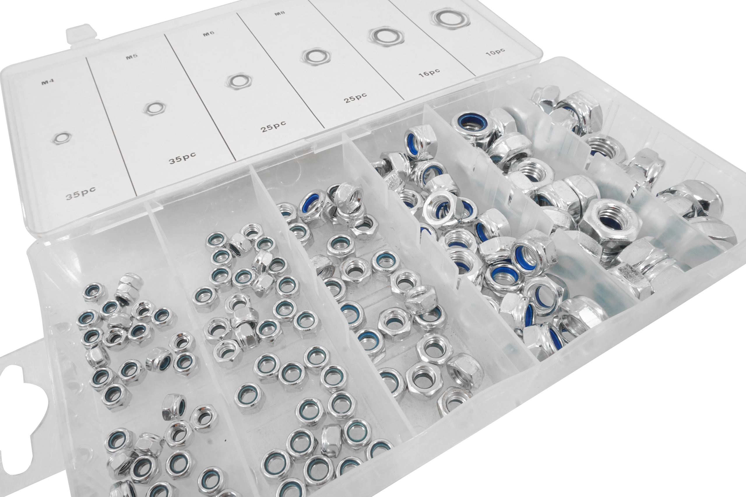 Набір 146 фрагментів метричних горіхів із захистом від спонтанного відкручення. Набір включає: M4, M5, M6, M8, M10, M12. Ціле розміщується у зручній "сортувальній" упаковці.