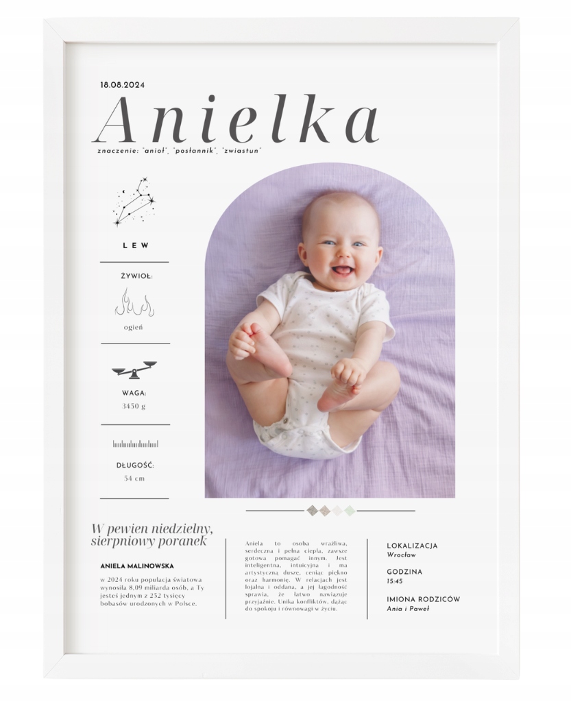 Це персоналізоване свідоцтво про народження з іменем, яке розповідає історію вашої дитини та день її народження.