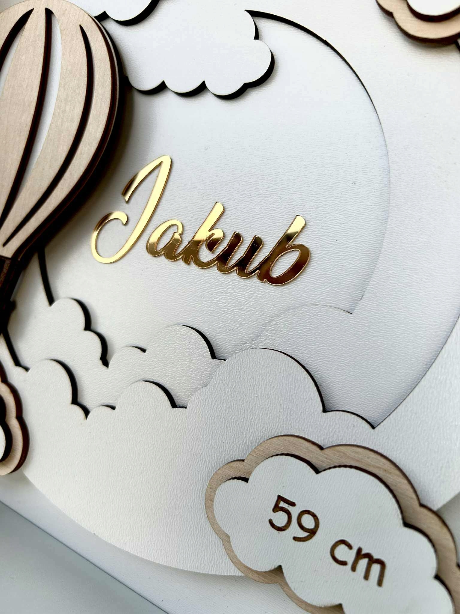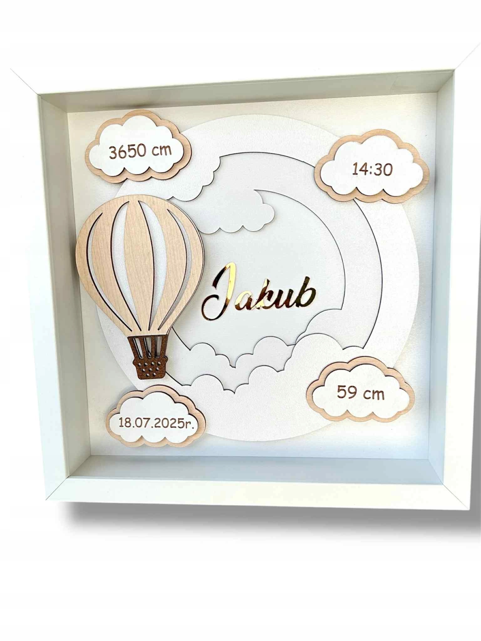 Чарівна рамка ручної роботи з записом - це прекрасний сувенір народження дитини або подарунок для хрещення, однорічний або дитячий душ. Ретельно розроблена композиція 3d з хмарами, повітряна куля та назва дитини надає інтер'єру теплий, унікальний персонаж.