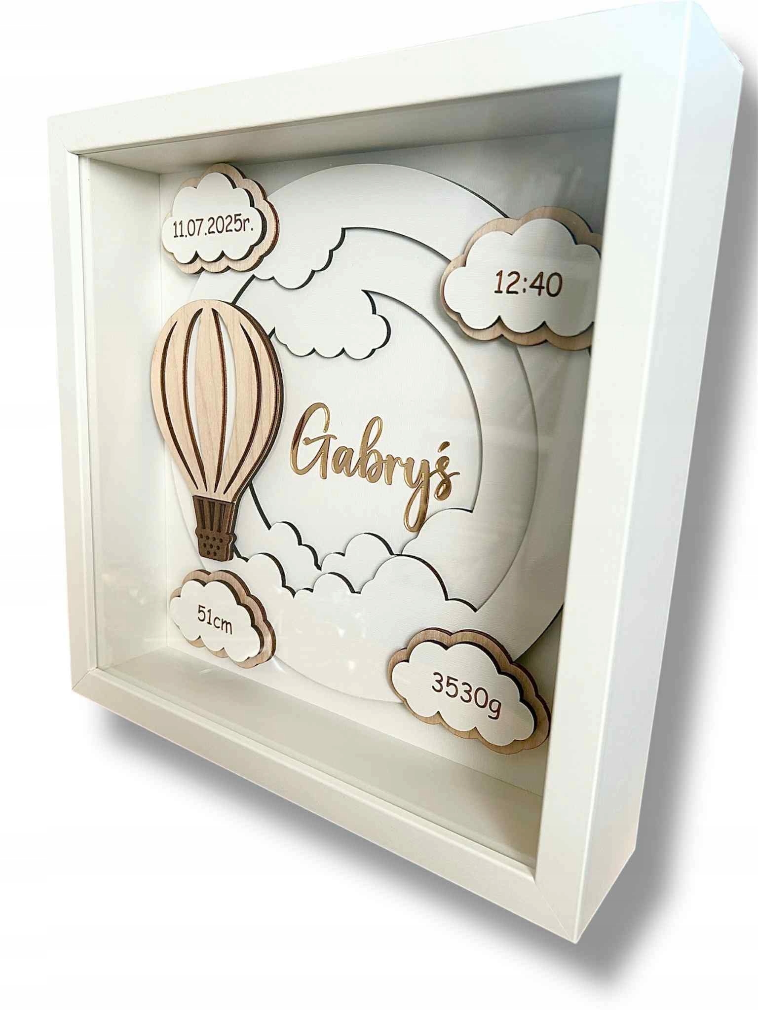 Чарівна рамка ручної роботи з записом - це прекрасний сувенір народження дитини або подарунок для хрещення, однорічний або дитячий душ. Ретельно розроблена композиція 3d з хмарами, повітряна куля та назва дитини надає інтер'єру теплий, унікальний персонаж.
