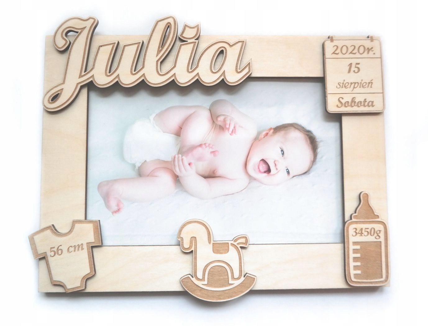 Дерев'яна фоторамка з ім'ям та свідоцтвом про народження дитини + фото БЕЗКОШТОВНО
