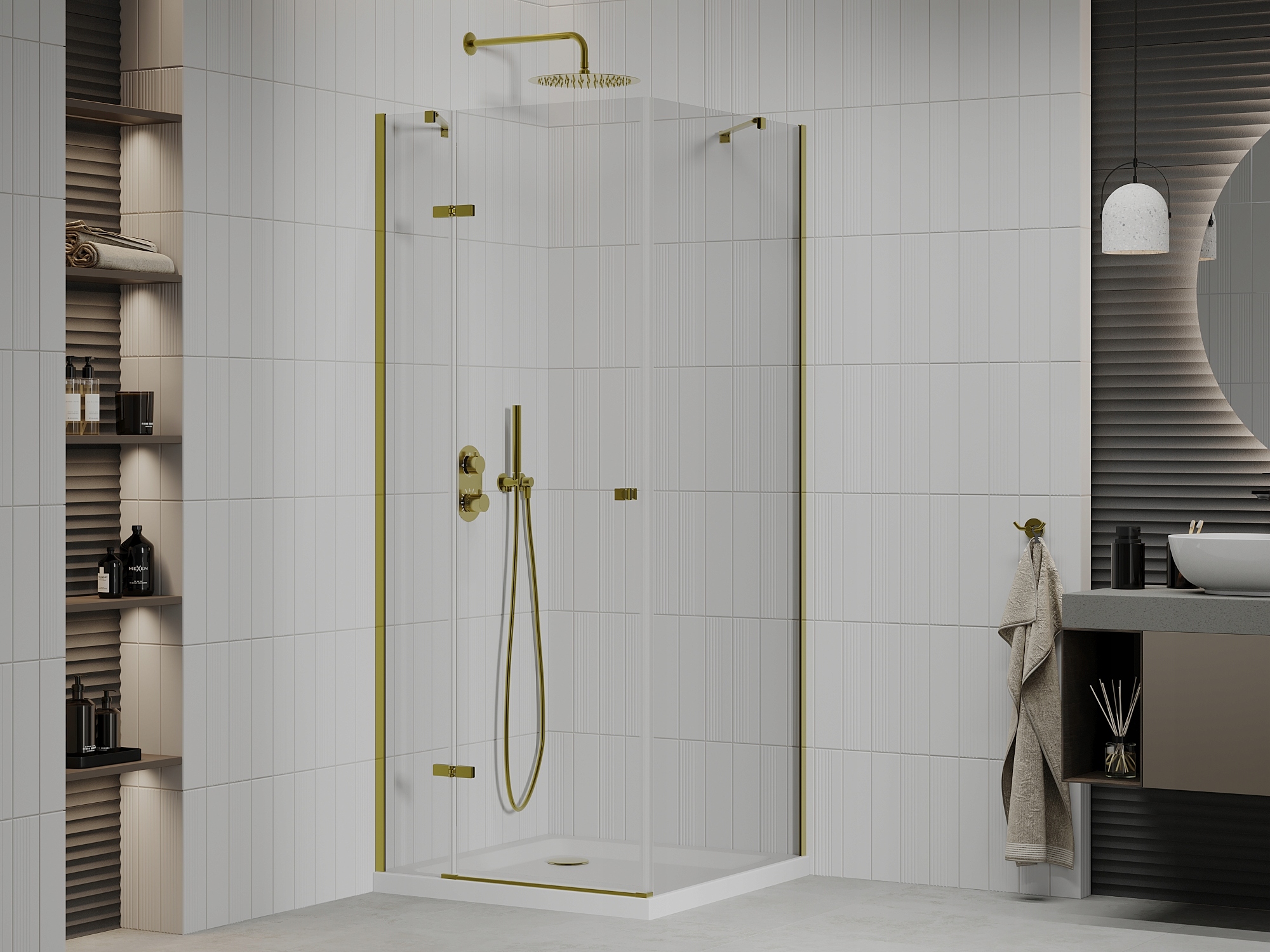 Відкидна душова кабіна Mexen Roma 90 х 90 см, прозора, золота + піддон Flat, білий + сифон, золота