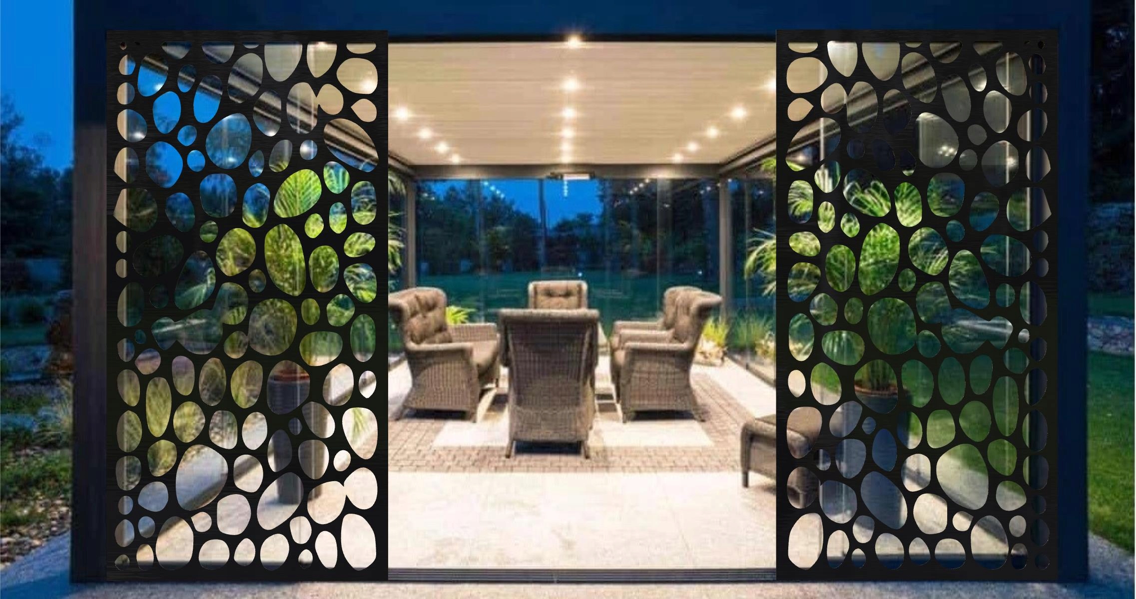 Вся конструкція панелі може бути розроблена таким чином, щоб візерунок на наступній панелі - це продовження попереднього шаблону. Панелі прості в установці можуть використовуватися як проміжок паркану, ворота, ворота, балюстрада, покриття стелі, декоративні стіни інтер'єру та альт, садові дахи, садові дахи, перголи та терасові будівлі. У кожному елементі ми можемо вирізати готові отвори для заклепок або кріпильних ручок відповідно до потреби замовника.