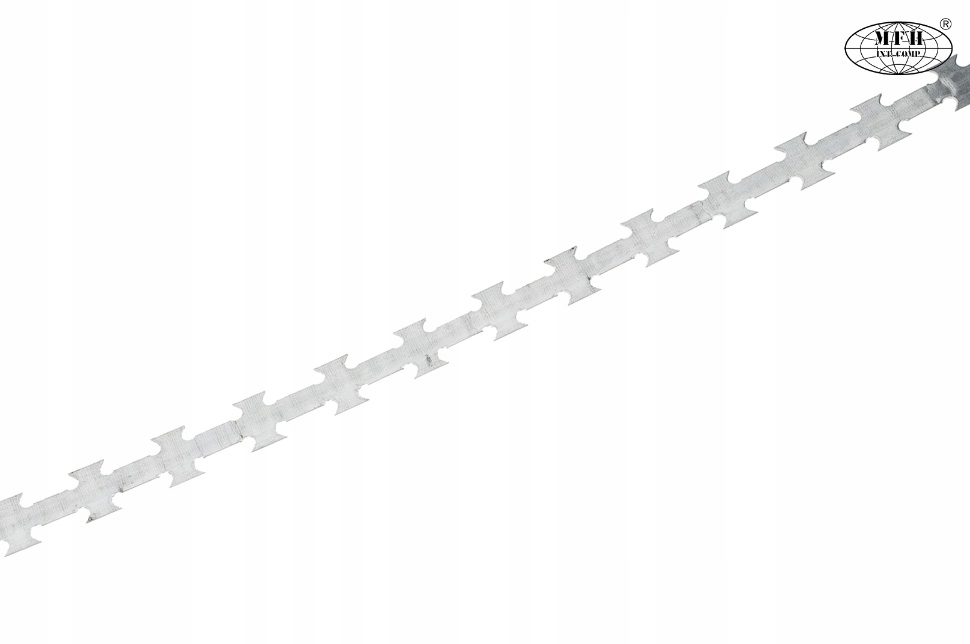Сучасний колючий дріт. Продукт німецького бренду MFH Int.Comp. Високоякісний продукт, військова специфікація. Використовується для будівництва та кріплення огорож, захисту обладнання, складів, спорудження огорож, контрольно-охоронних постів. Підходить для підвішування на огорожах, естакадах і безпосередньо на будівлях. Дуже гострі та щільно розташовані леза бритви запобігають проходу небажаної людини чи тварини. Спроба проштовхнути дріт призводить до пошкодження одягу, численних травм або постійного зачеплення.