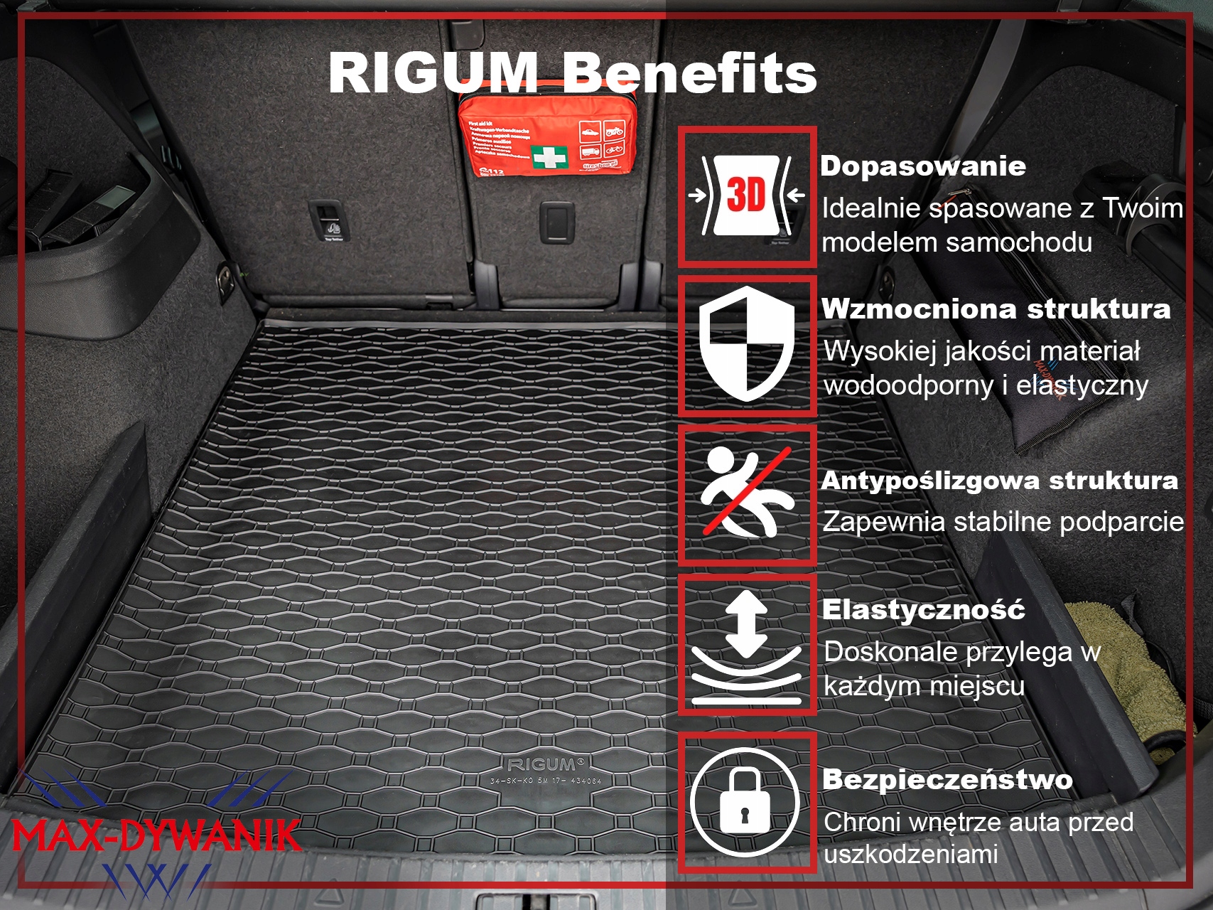 Останній продукт нової лінії RKK від Rigum — це поєднання практичності та інновацій. Завдяки сучасним можливостям килимок ідеально підійшов до форми багажника з урахуванням найважливіших параметрів автомобіля, таких як марка / модель / рік / кузов або версія комплектації багажника. 3D-сканування простору багажника дозволяє відтворити його форму 1:1 і спроектувати килимок. Килимок має унікальний стільниковий візерунок, створений з урахуванням візуальних і практичних аспектів. Килимок був розроблений таким чином, щоб дозволити використовувати точки кріплення в черевику (тиснення на килимку, яке, за необхідності, має бути розрізане, щоб використовувати тримачі сітки). Вставка виготовлена ​​з високоякісної гумової суміші, яка не виділяє неприємного запаху гуми та стійка до фізичних та хімічних факторів.