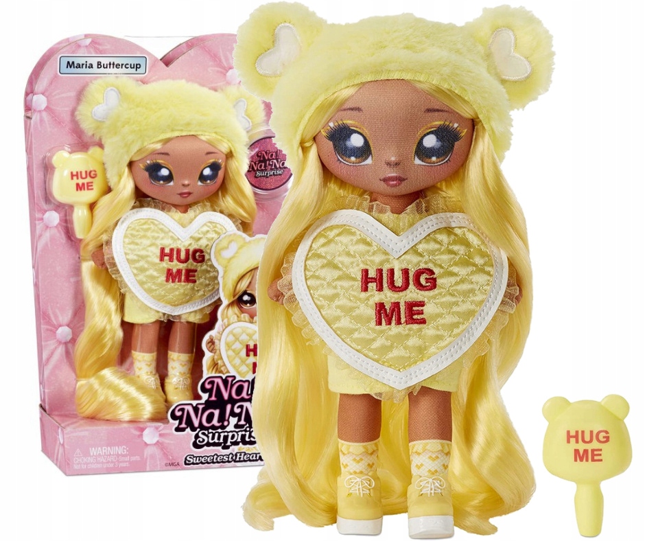 Прекрасна, сонячна лялька Марія Лютик має чудове поєднання жовтого, довге волосся, укладене у завиті хвилі. Використовуйте щітку, що входить у комплект, щоб укласти її волосся! На обличчі та одязі Марії надруковані деталі. На ній пухнастий капелюх у формі ведмедика з милими сердечками у вухах, короткий топ, стьобане плаття у формі серця з рюшами та вишитим написом «Обійми мене», кросівки з ведмедиком і пензлик у формі ведмедика з милим написом «обійми мене». Сама лялька зроблена з м'якого матеріалу і ідеально підходить для обіймів!