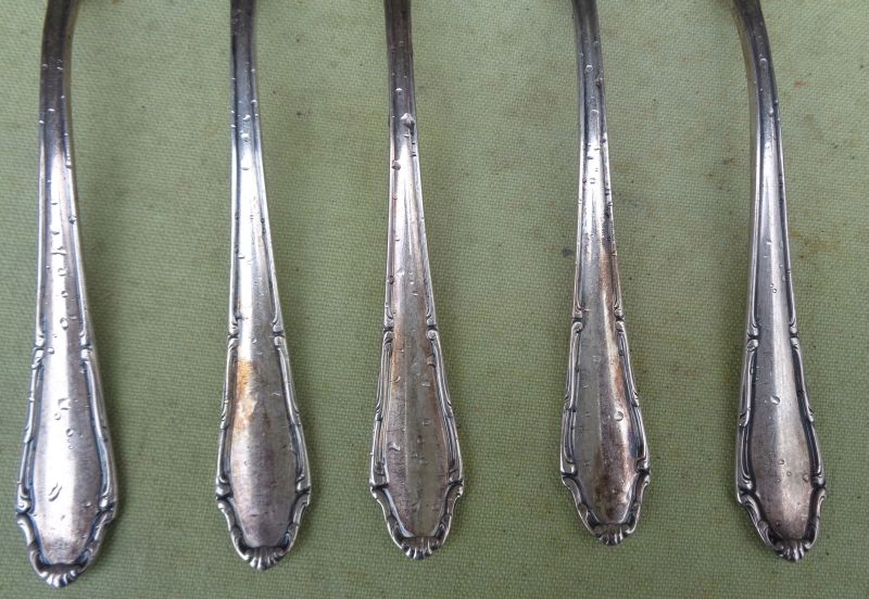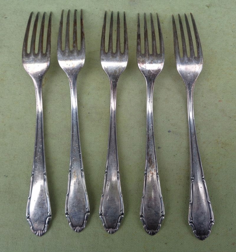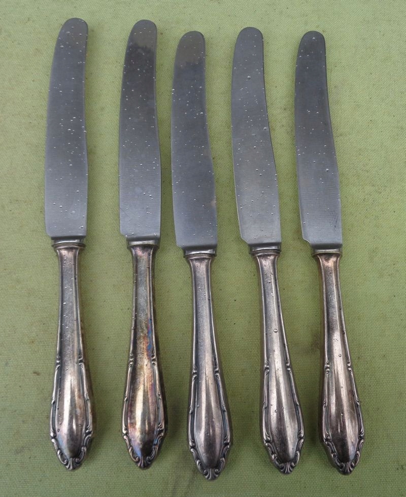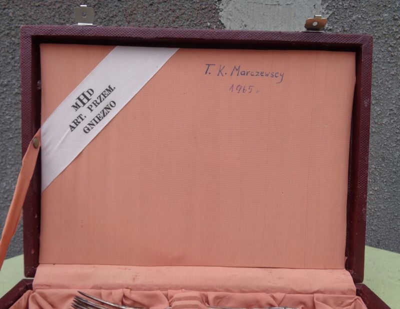 Цікавий, цікавий набір тарілчастих столових приборів 1960-х років. Експонати знаходяться в оригінальній фірмовій упаковці. Набір був придбаний в магазині MHD Articles of Industry Gniezno в 1960-х роках, логотип якого знаходиться всередині упаковки. Додатково на кришці коробки є рукописний напис ручкою, кому належав набір і в якому році він був придбаний. Всередині коробка обшита рожевим матеріалом. Набір складається з п'яти ножів і п'яти виделок. Не вистачає одного ножа та виделки. Ручки як ножа, так і вилки багато прикрашені цікавим орнаментом. По краях ручок з'являється орнамент. Ножі та виделки посріблені 90 мікрон срібла. Леза ножів були виготовлені на фабриці в Золінгені. На ножах і виделках є позначки, які видно на фото. Стан експонатів видно на фото. Рекомендую всім.