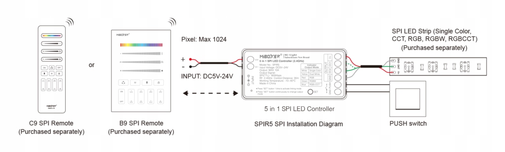 Контролер MiBoxer SPIR5 – це вдосконалений пристрій, розроблений для SPI (цифрових, адресних) світлодіодних стрічок. Завдяки технології передачі 2,4 ГГц RF він забезпечує стабільне та чутливе керування світлом без необхідності використання кабелів керування.