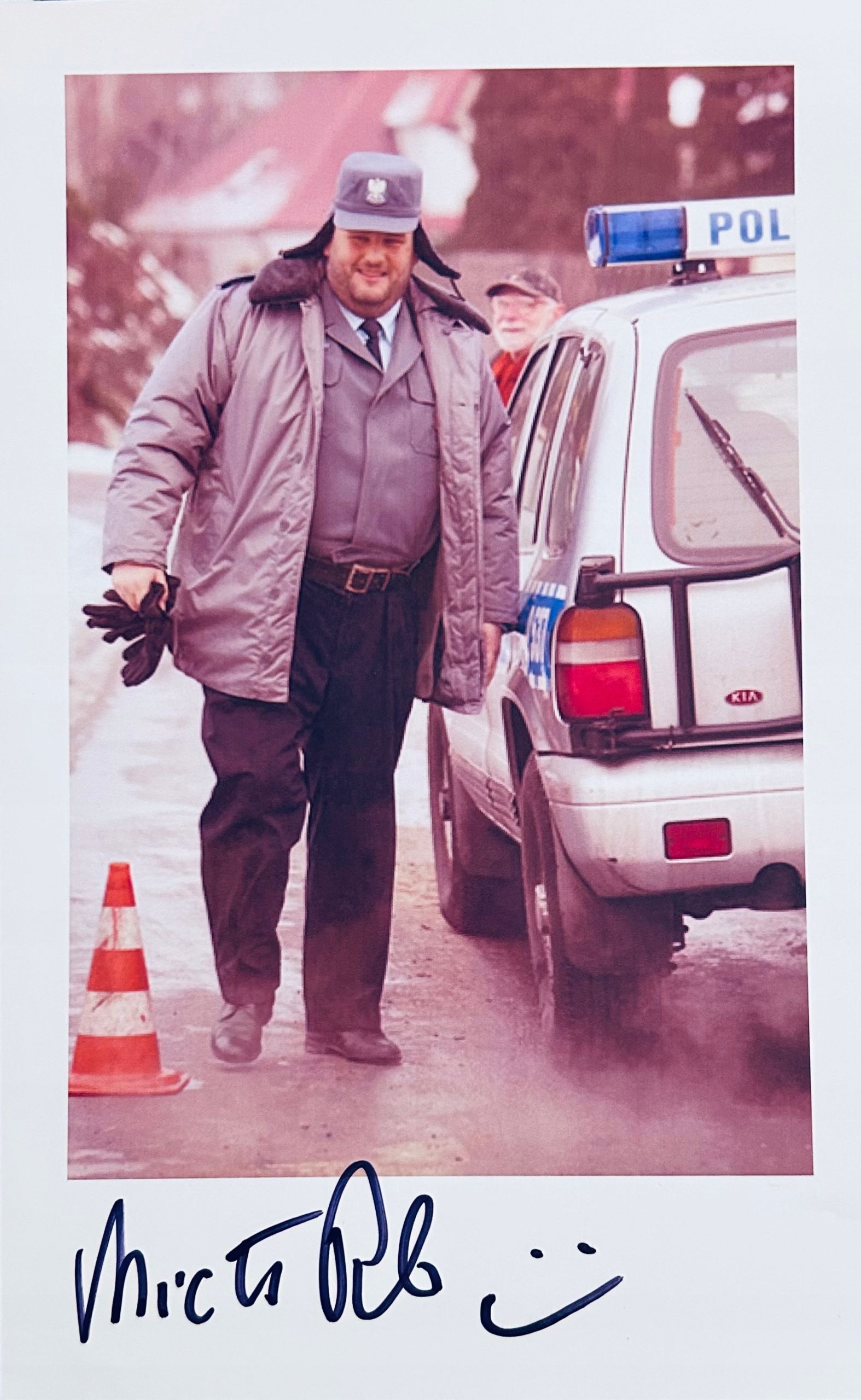 Предметом продажу є оригінальний рукописний автограф МІХАЄЛА ПІЛЯ, який виконав роль, серед іншого, аспіранта Мечислава Нокула із серіалу «Отець Матеуш».