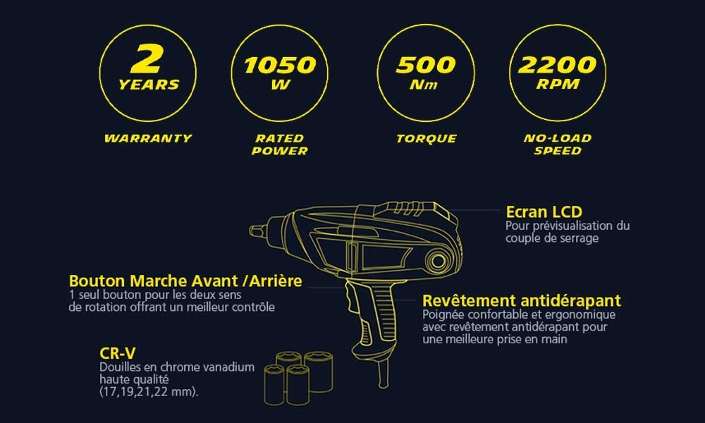 - Назва типу елемента : Електрична викрутка удару, 1050 Вт, крутний момент регулюється до 350 нм, послаблення моменту 500 нм, 3 м кабель, 2200 об/хв на хвилину