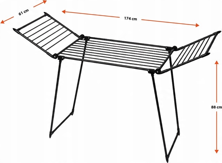 Сушарка горизонтальна, стояча, з відкидним крила, які дозволяють сушити більше білизни. Завдяки товстим дротам він запобігає утворенню складокна речах одягу та водночас скорочує процес прасування.