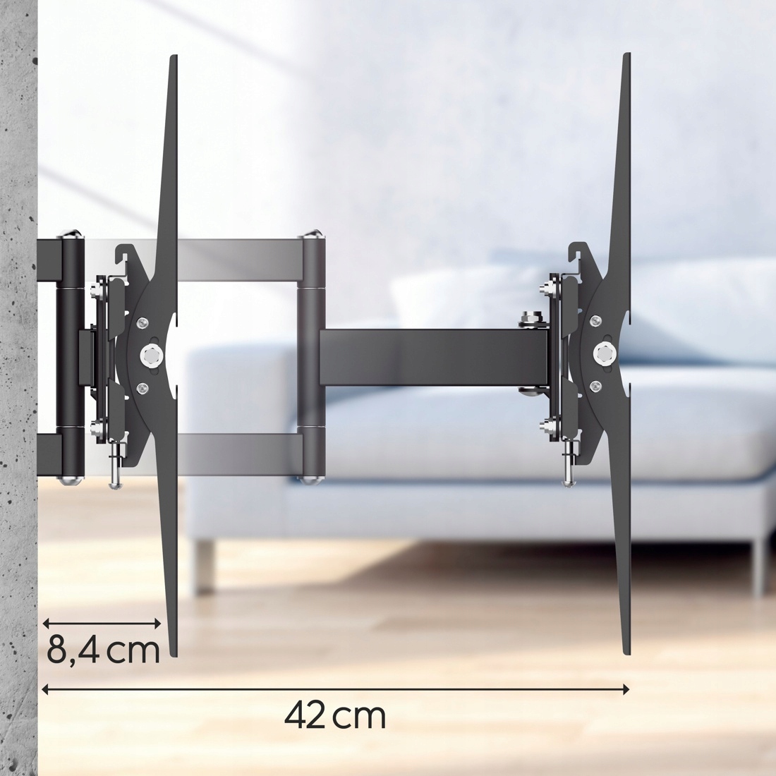 Після встановлення телевізора настінне кріплення можна повністю відрегулювати відповідно до ваших потреб і змінити положення в будь-який час. Завдяки цьому зображення завжди буде добре видноз будь-якої точки кімнати. Hama Fullmotion дозволяє нахиляти телевізор, переміщати його вбік, а також збільшувати та зменшувати масштаб стіни.