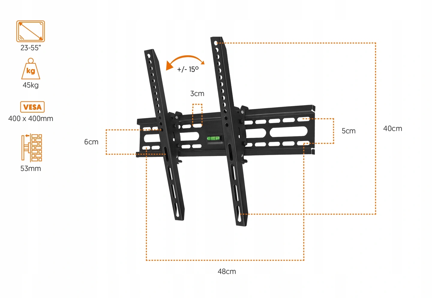 - Неймовірно міцне кріплення для телевізора з можливістю регулювання кута нахилу +/- 15° (вгору/вниз), яке здатне задовольнити вимоги навіть для найвибагливіших користувачів. li>