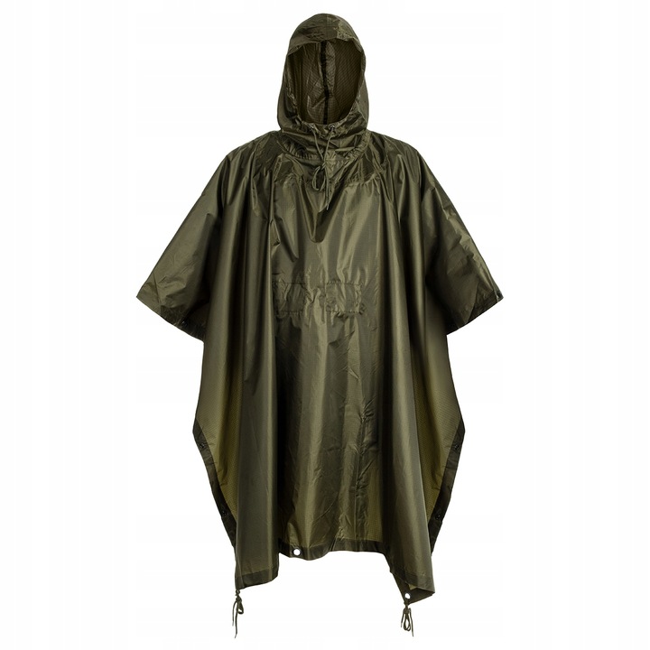 Пончо MFH RIPSTOP OD Green 144X223cm 08524B - зроблено з міцного поліестеру. Його можна використовувати для будівництва намету, як водонепроникний чохол для спального мішка, ізоляції землі або для маскування. Капюшон оснащений шнурком. Великою перевагою накидки є невелика вага і невеликі розміри в складеному вигляді. Накидка добре підійде як у полі, так і для щоденного використання під час дощу. Завдяки матеріалу, з якого він виготовлений, його можна легко скласти, тому він не займає багато місця.