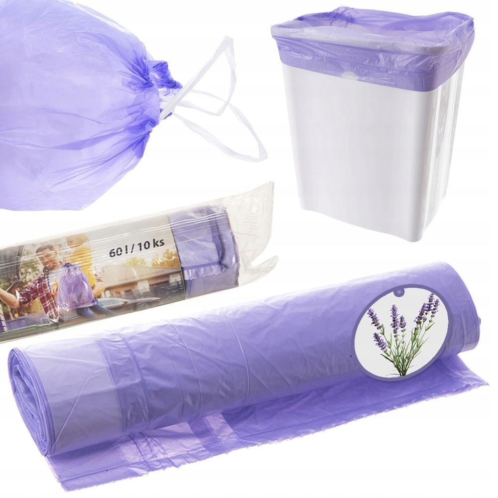 Набір з 10 пакетів для сміття ємністю 60 л. Виготовлений з фіолетового HDPE. Сумки мають аромат лаванди і оснащені шнурком.