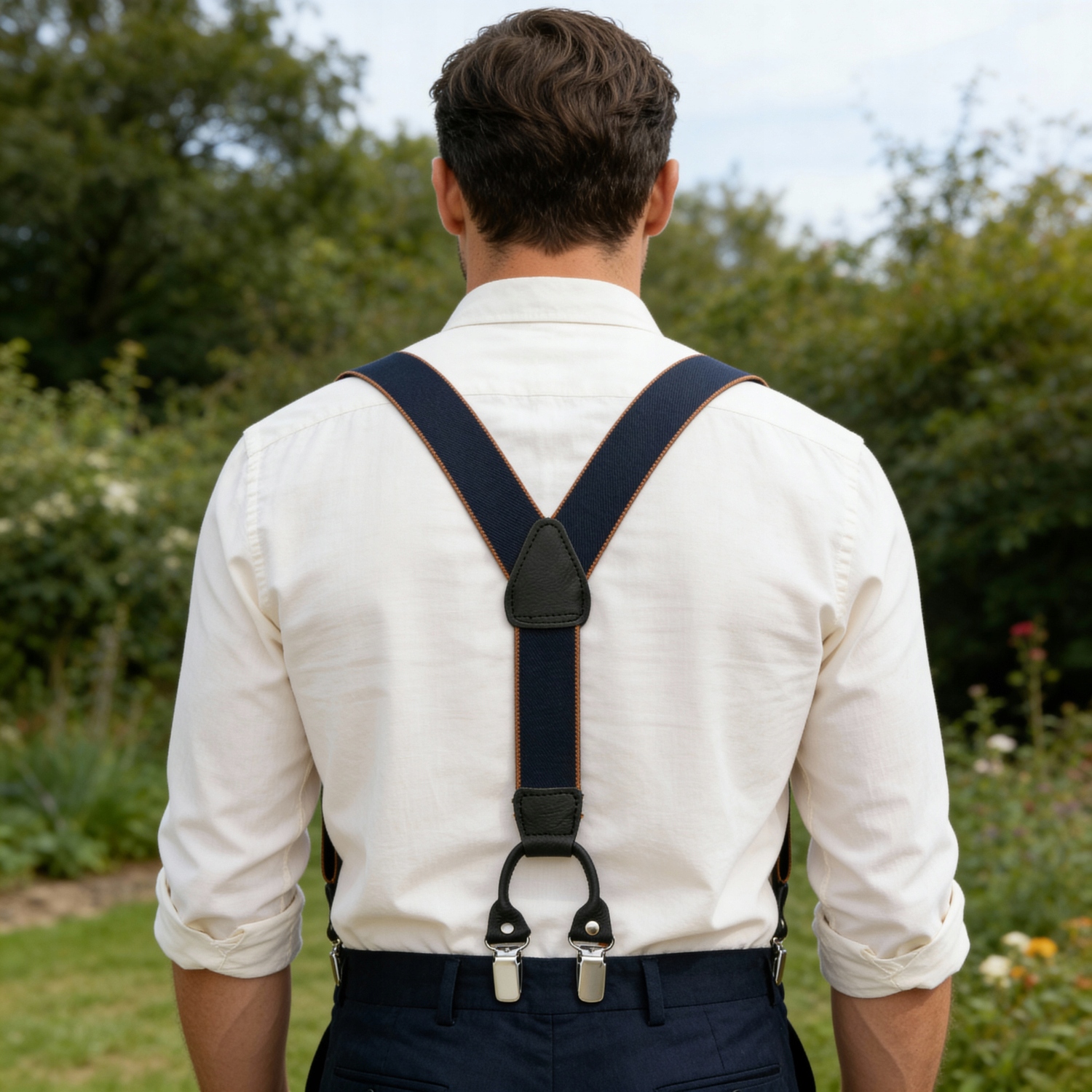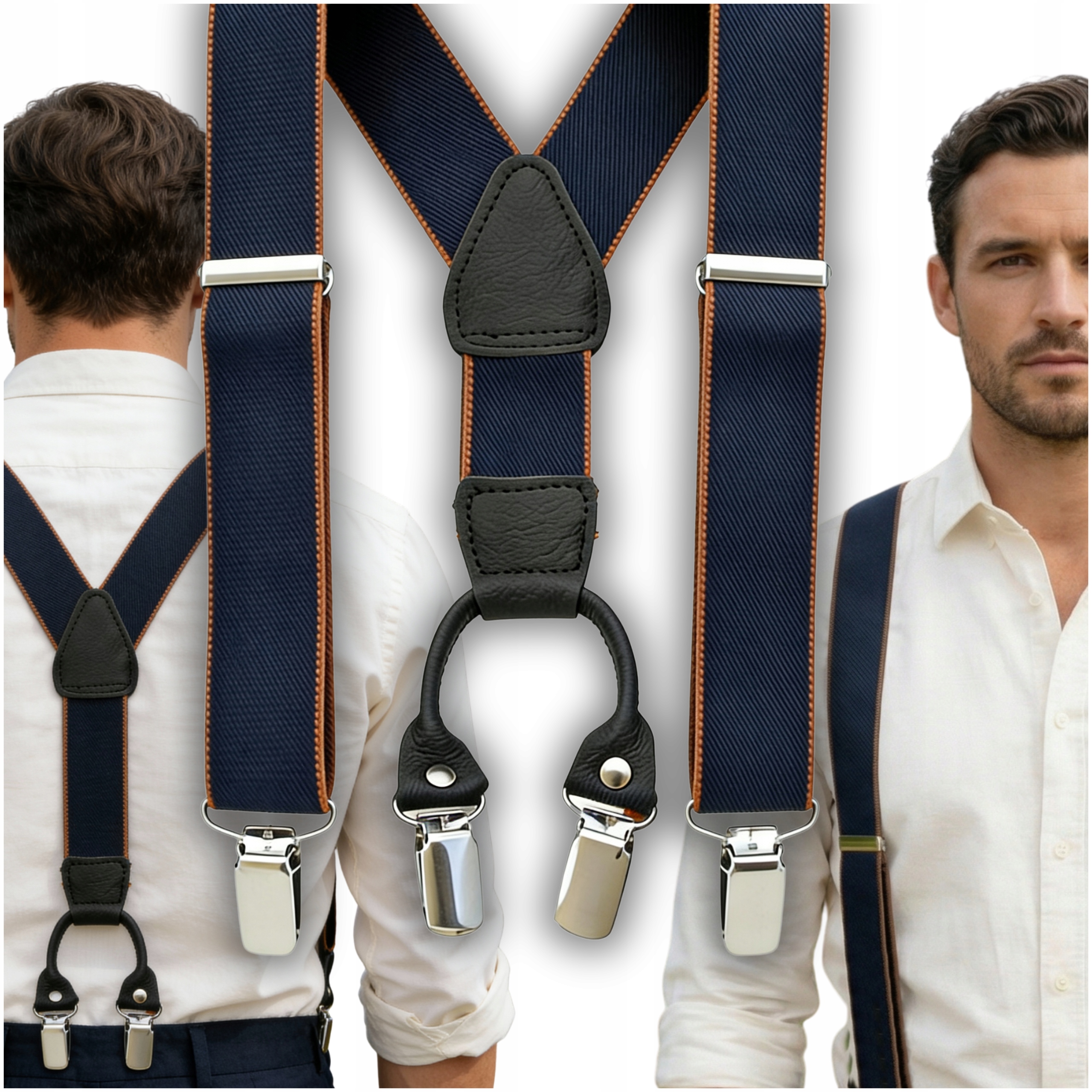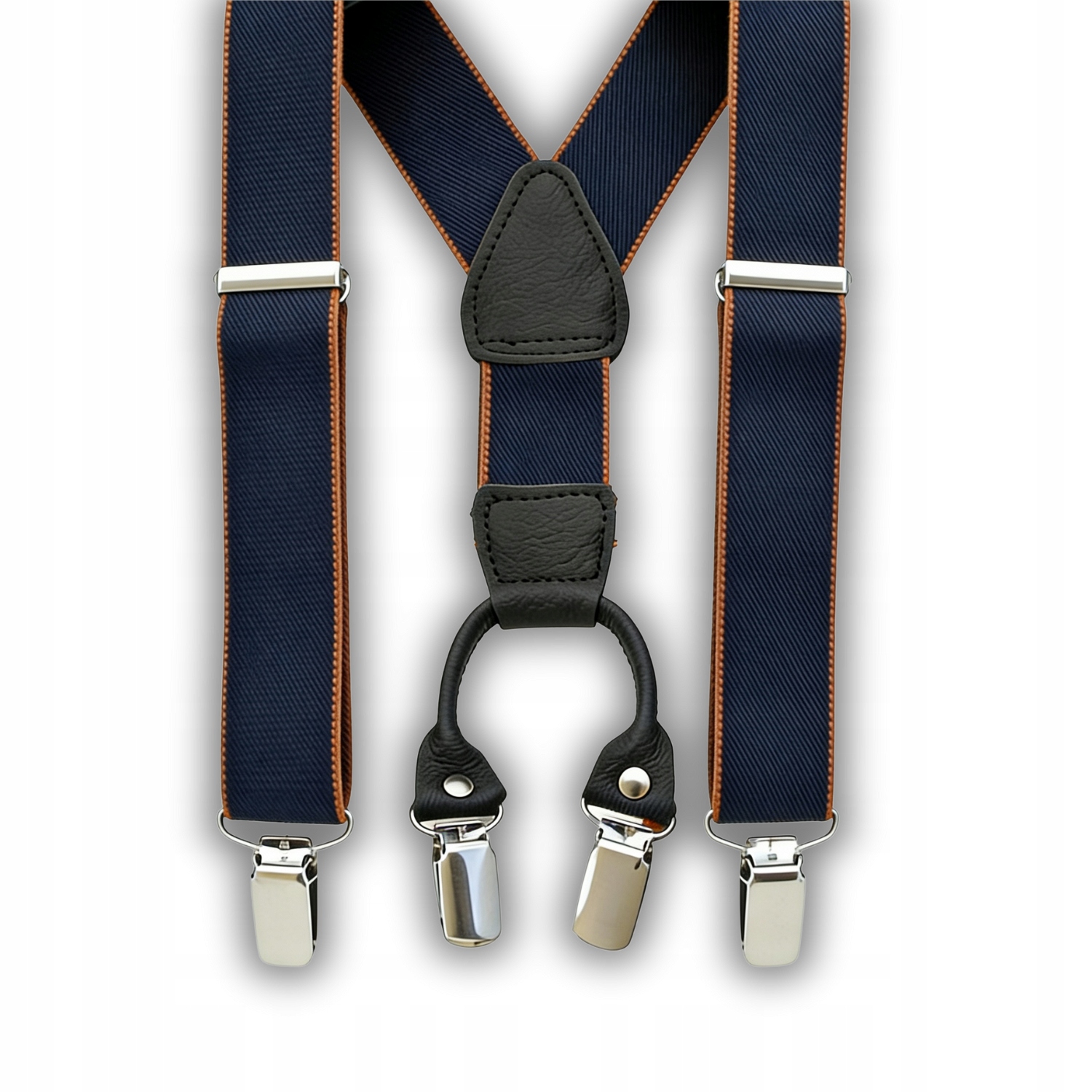 Елегантні, класичні підтяжки 3,5 см, темно-сині з помаранчевими краями