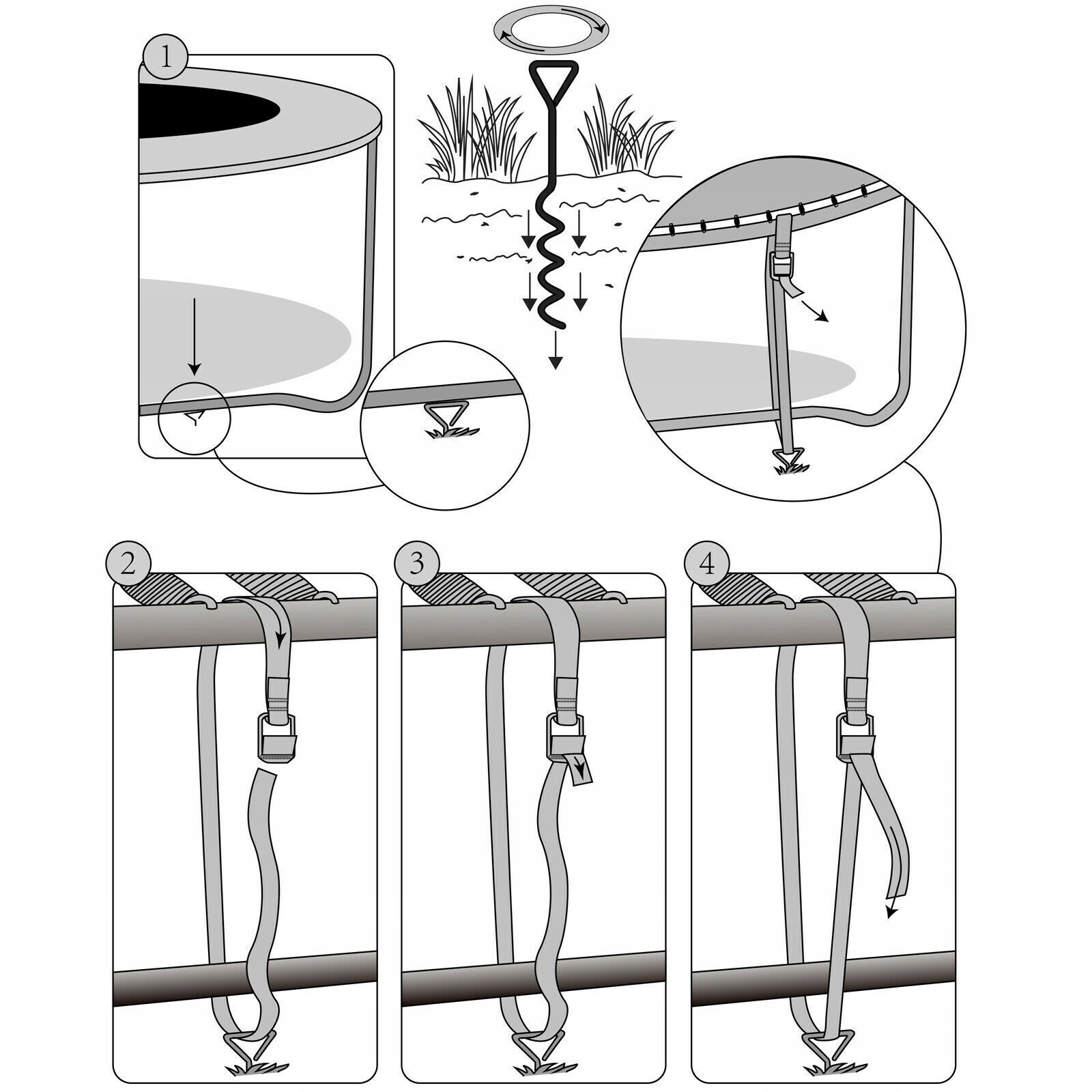 Набір з 4 ґрунтових якорів не тільки забезпечує оптимальний захист батуту, але також може бути використаний як підтримка намету, гойдалків, слайдів, баскетбольних ободів або Інше зовнішнє обладнання.