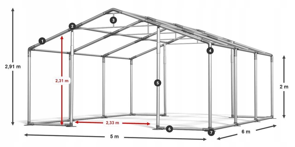1 - Конструкційні труби fi 50 мм 2 - Конструкційні з'єднувачі fi 54 мм 3 - Посилена конструкція даху 4 - Міцні гвинти через 5 - Посилення b> входи 6 - Посилена структура підлоги 7 - Збільшені фути fi 14 см
