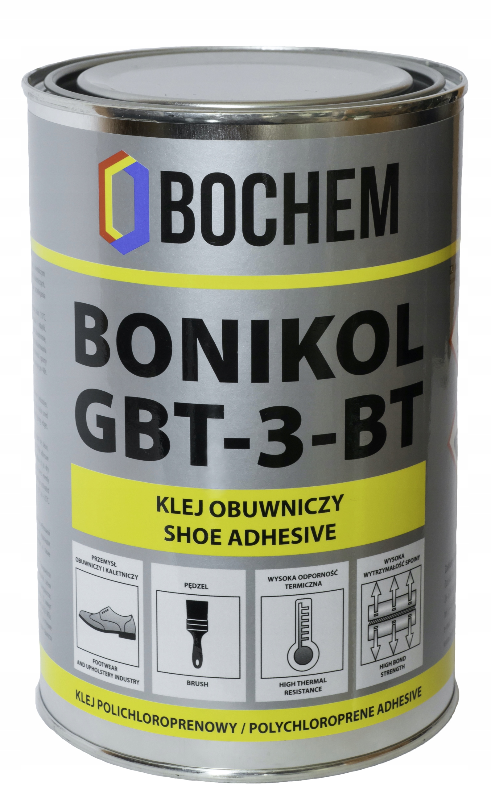 БОНІКОЛ ГБТ-3-БТ - однокомпонентний клей на основі розчину поліхлоропренових каучуків в органічних розчинниках. Клей використовується як допоміжний клей у взуттєвій, шкіряній та меблевій промисловості. Bonikol GBT-3 має позитивний рейтинг від CLPO у Кракові та PZH у Варшаві для використання у взуттєвій промисловості. Не містить толуол. Місткість: 0,8 кг