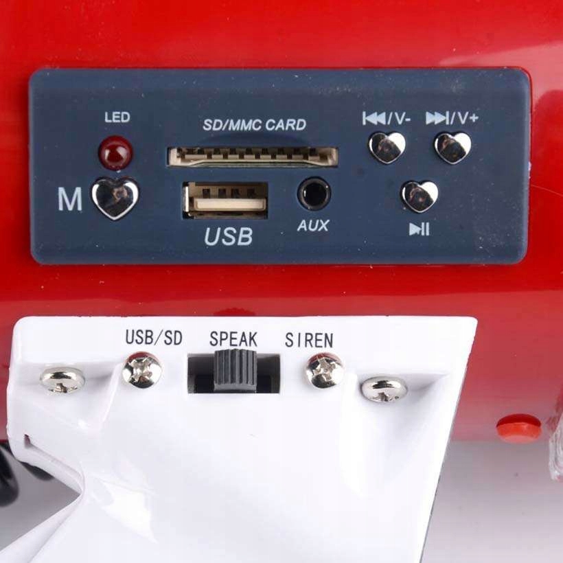 Це єдиний мегафон на ринку, в якому, крім функції передачі голосу від мікрофона і сирени, можна записувати будь-які пісні або звуки у форматі MP3 і відтворюйте їх за допомогою вбудованого програвача. Крім того, він має дуже потужну та ефективну вбудовану сирену з модуляцією, подібною до сигналу поліції чи швидкої допомоги, яка, отже, може служити сигналом тривоги.