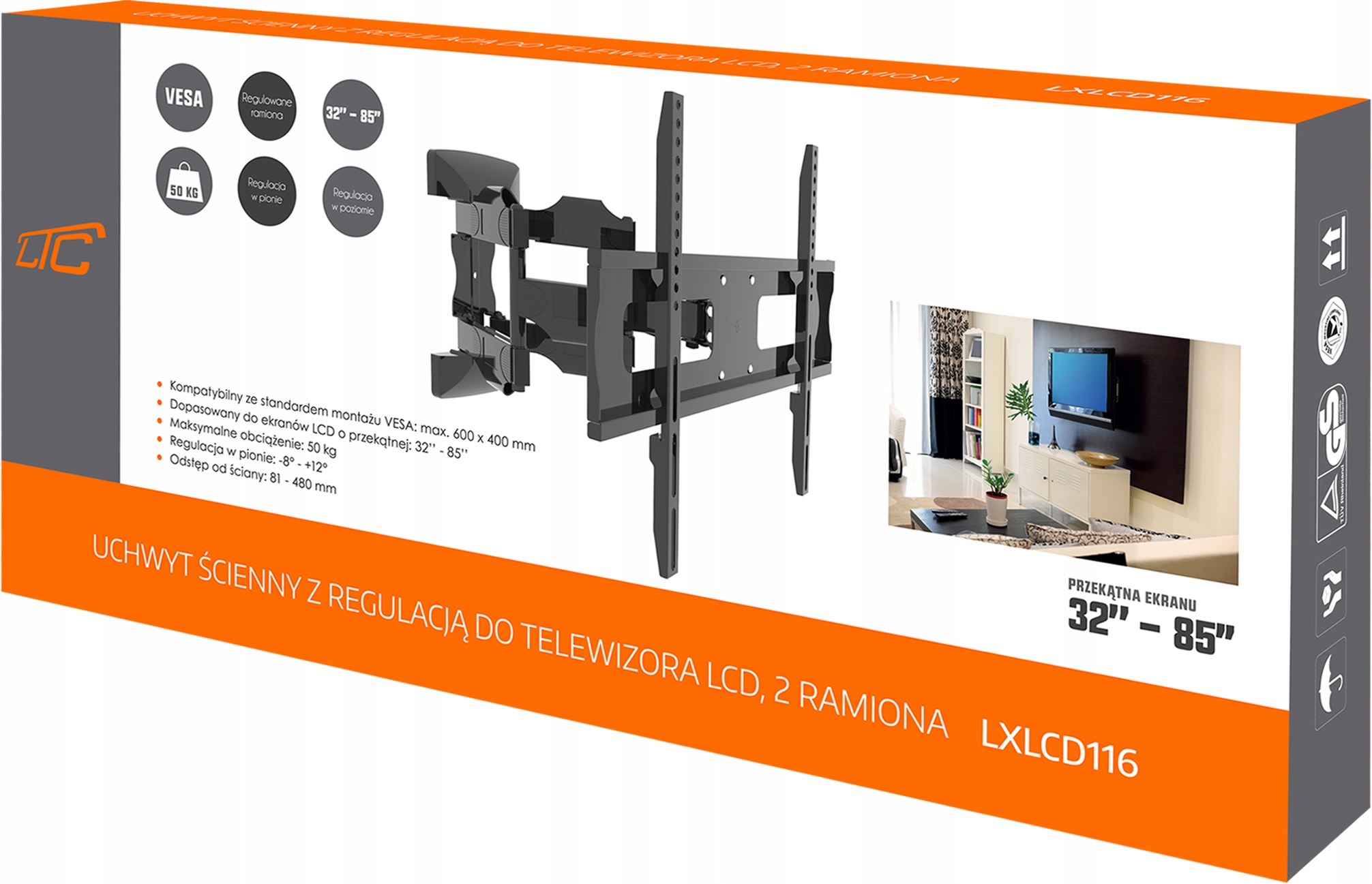 - Вага встановленого телевізора – це одна з ключових відомостей. Ви повинні перевірити вагу, вказану виробником в інструкції. Важливо, однак, ви повинні взяти до уваги вартість, яка не включає тумбу під телевізор. Очевидно, що вага телевізора має бути меншою за максимальне навантаження на кріплення. Так ми будемо впевнені, що вся конструкція витримає і наша техніка не впаде з гуркотом на підлогу. На тримач, представлений на цьому аукціоні, можна навантажувати до 50 кг.