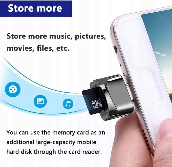 Цей пристрій для зчитування карток Micro SD працює з такими пристроями, як ноутбуки, смартфони та планшети з портами USB-C. Працює тільки з картами пам'яті TF/MicroSD. Сумісний із картами пам’яті TF/Micro SD/Micro SDHC/Micro SDXC.