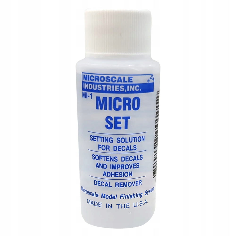 Micro Set — це дуже універсальне рішення для налаштування наклейок, яке робить кілька функцій із наклейками мікромасштабу, щоб оптимізувати їх застосування. Micro Set слід наносити на поверхню моделі, на яку ви будете наклеювати декаль з паперової підкладки. Micro Set готує поверхню спеціальними зволожуючими речовинами, які перетворюють клей на зворотному боці наклейки на більш міцний і довговічний. Крім того, Micro Set м’яко пом’якшує фольгу декалів, роблячи її більш гнучкою та краще адаптуючись до поверхні моделі. Краще зчеплення наклейки з моделлю запобігає утворенню дрібних повітряних бульбашок і створює невидиму фольгу-носій для т.зв. "розмальований ефект".