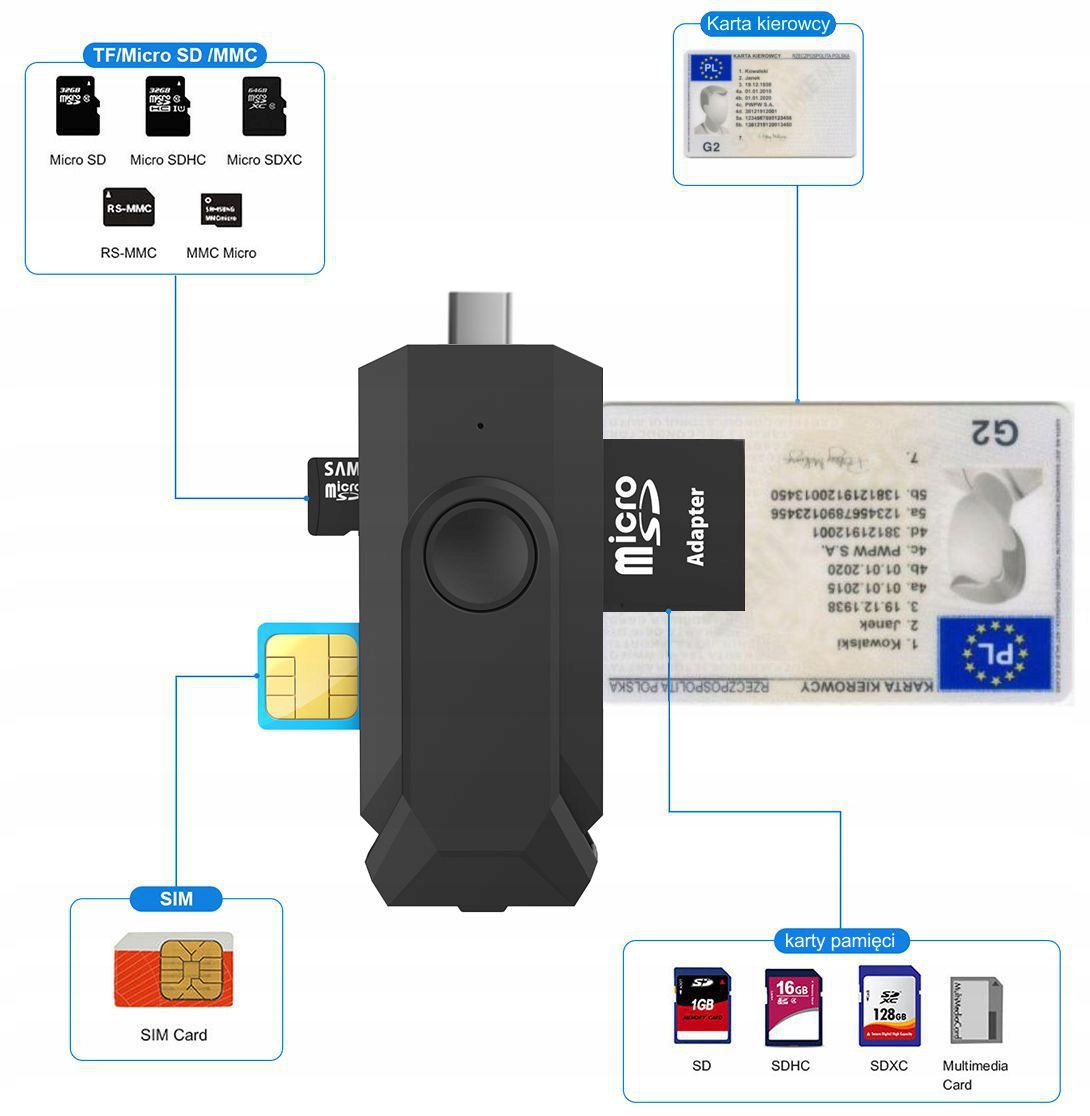 Додатково читає з карт пам'яті - TF/micro SD / MMC, SD, SDHC, SDXC, мультимедійних і SIM-карт