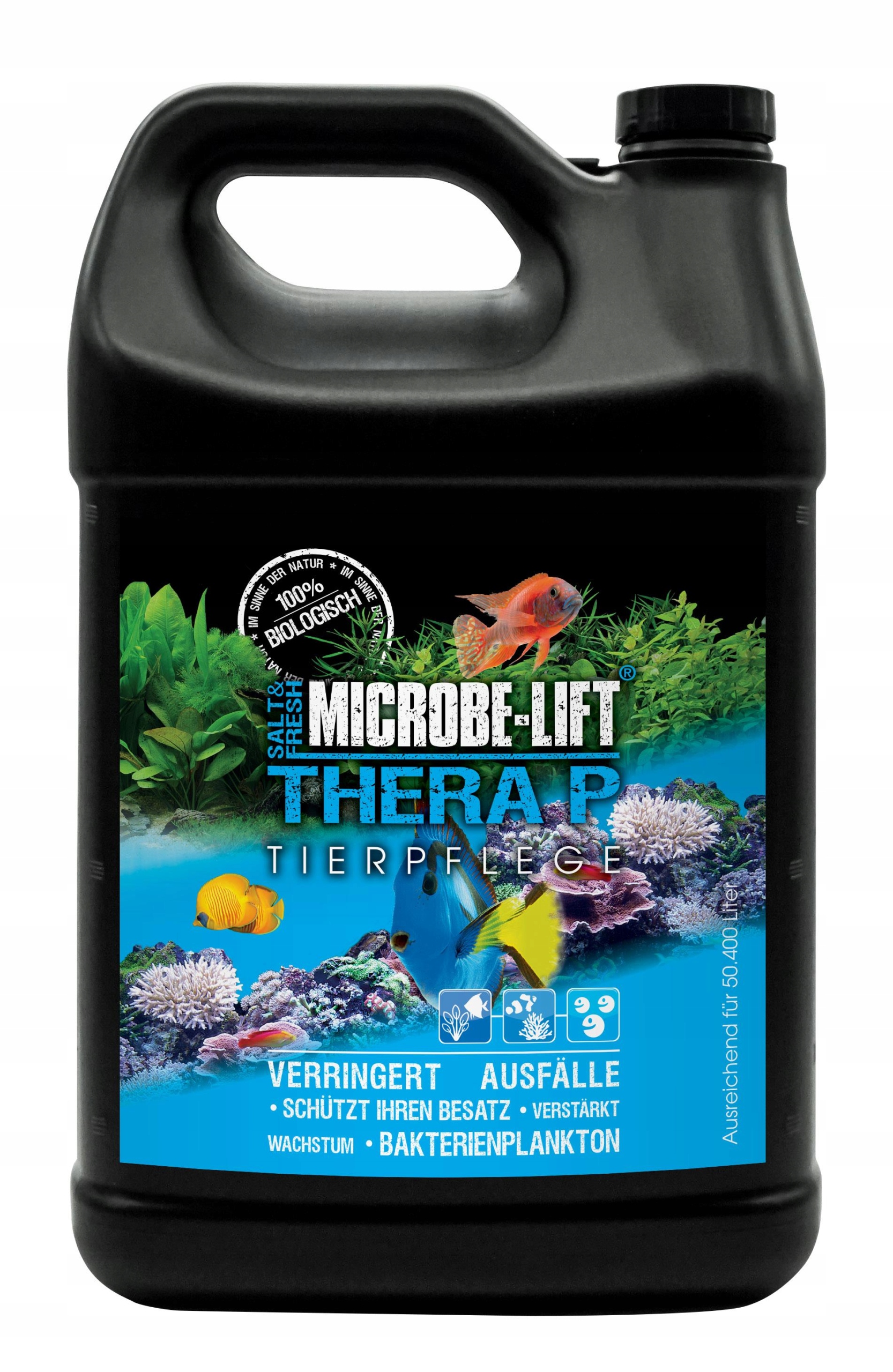 TheraP - Засіб для поліпшення якості води в акваріумі, забезпечення кращого імунітету риб, рослин та інших організмів. Забезпечує природні стабільні умови в акваріумі. Покращує якість води та стійкість риб до хвороб і паразитів. Створено на основі натуральних інгредієнтів. Не містить штучних хімікатів. Стабілізує та підтримує оптимальні умови для розвитку корисної мікрофауни (бактерій). Це допомагає підтримувати стабільні біологічні та хімічні умови, створюючи хороші умови для розмноження.