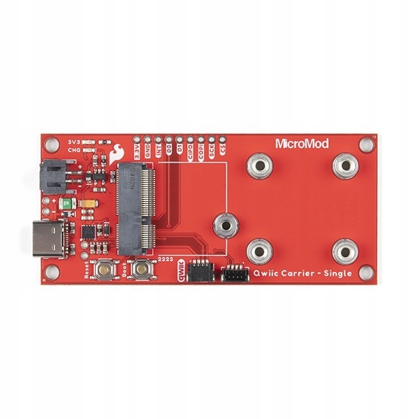 MicroMod Qwiic Carrier Board — це плата розширення, призначена для основних модулів MicroMod. Оснащений роз'ємом Qwiic і одним місцем для кріплення модулів серії Qwiic. На платі є роз'єм USB Type-C, який можна використовувати для живлення, системного програмування та зв'язку. Модуль з мікроконтролером підключається до роз'єму M.2. Крім того, на платі є кнопки Reset і Boot, схема зарядки і стабілізатор напруги 3,3 В. На сторінці продукту є посібник із зразками програм, які полегшують початок роботи з набором.