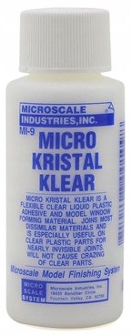 Microscale 09 Micro Kristal Klear - 1 PC Micro Kristal Klear може зробити стільки, що це суттєво змінить зовнішній вигляд ваших моделей. Перш за все, Micro Kristal Klear - це рідина, яка дозволяє утворювати дуже реально виглядати невеликі вікна приблизно до 1/4 дюйма. Це також клей для монтажу прозорих пластикових елементів, вікон тощо на моделях.